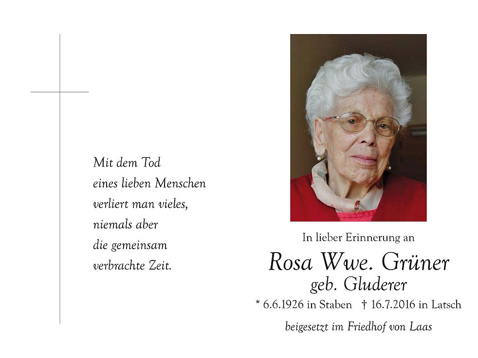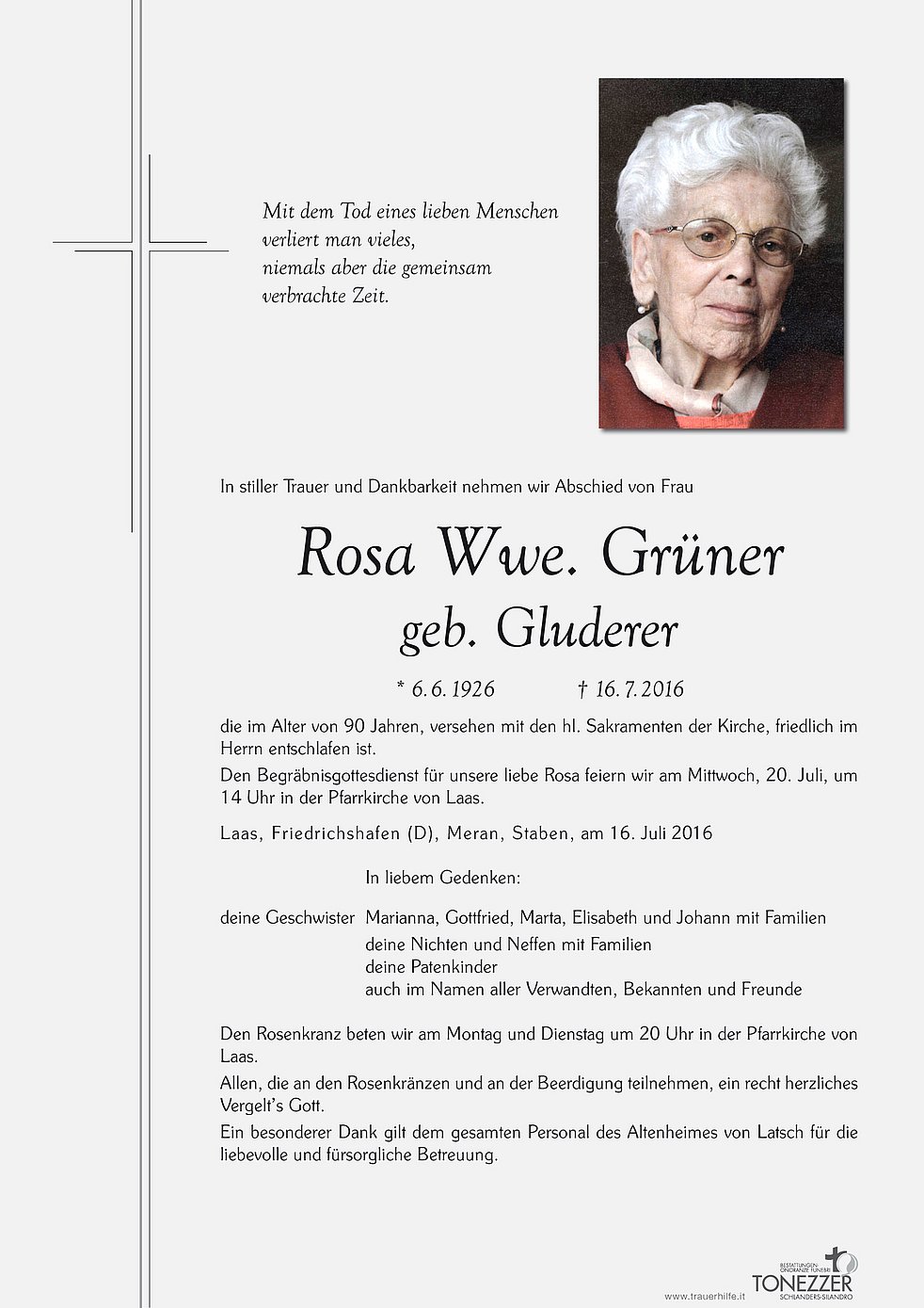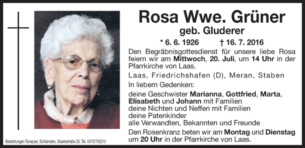 Den Begräbnisgottesdienst für unsere liebe Rosa feiern wir am Mittwoch, 20. Juli, um 14 Uhr in der Pfarrkirche von Laas.