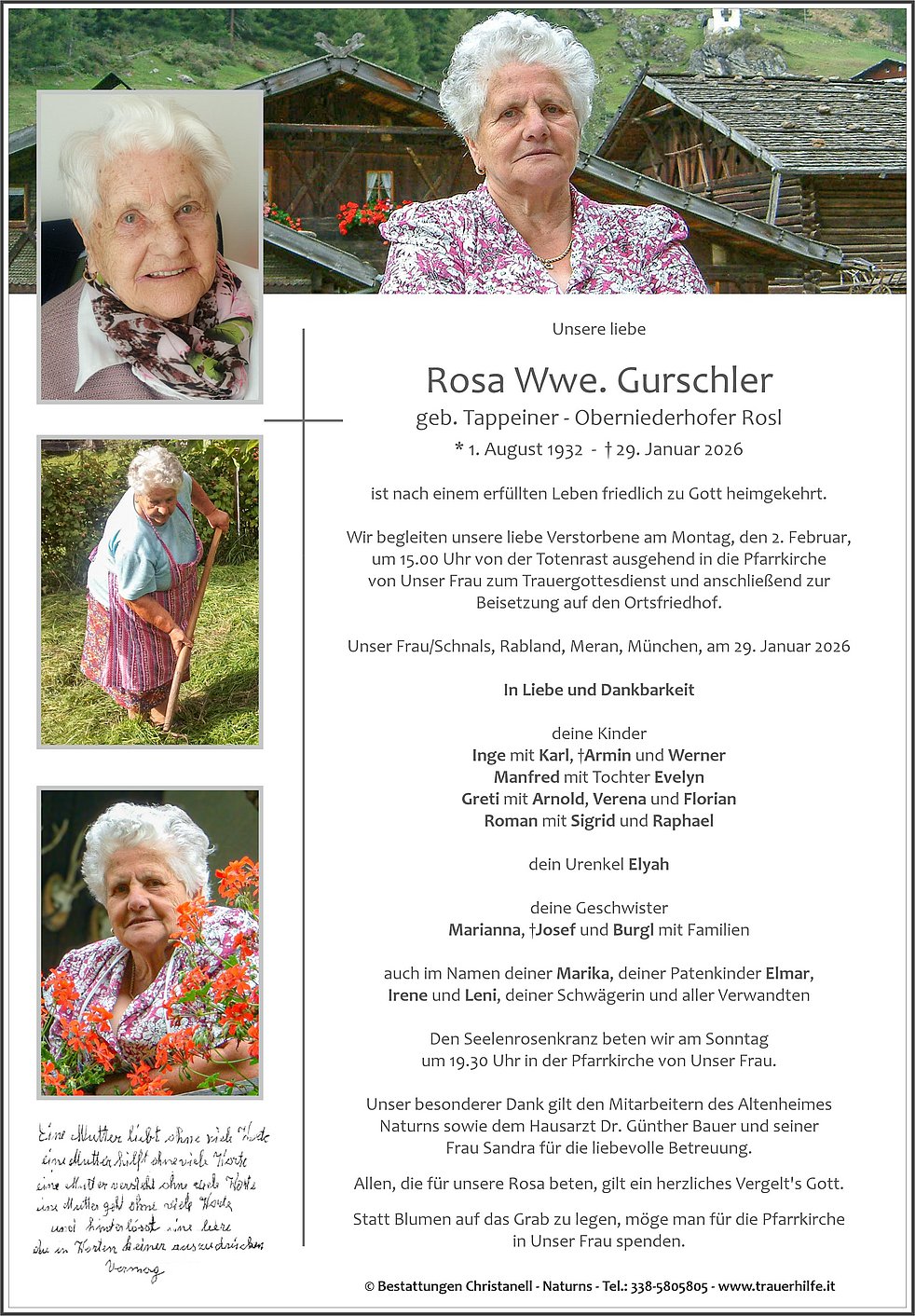 Wir begleiten unsere liebe Verstorbene am Montag, den 2. Februar, um 15.00 Uhr von der Totenrast ausgehend in die Pfarrkirche von Unser Frau zum Trauergottesdienst und anschließend zur Beisetzung auf den Ortsfriedhof.