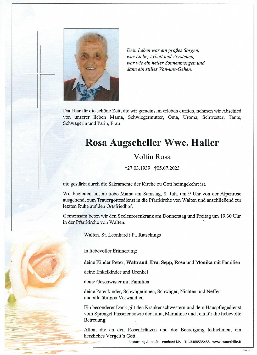 Wir begleiten unsere liebe Mama am Samstag, 8. Juli, um 9 Uhr von der Alpenrose ausgehend, zum Trauergottesdienst in die Pfarrkirche von Walten und anschließend zur letzten Ruhe auf den Ortsfriedhof.