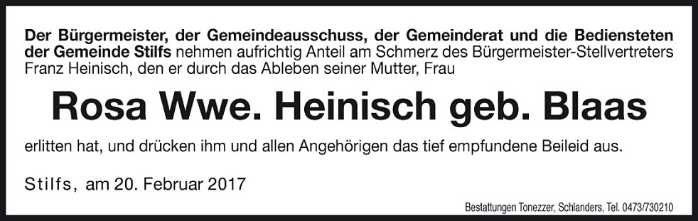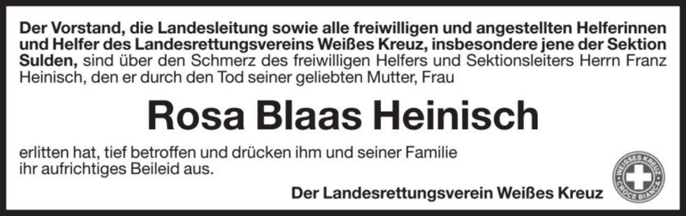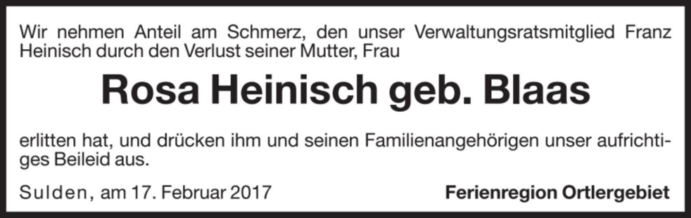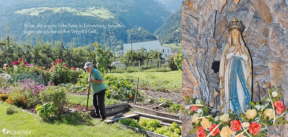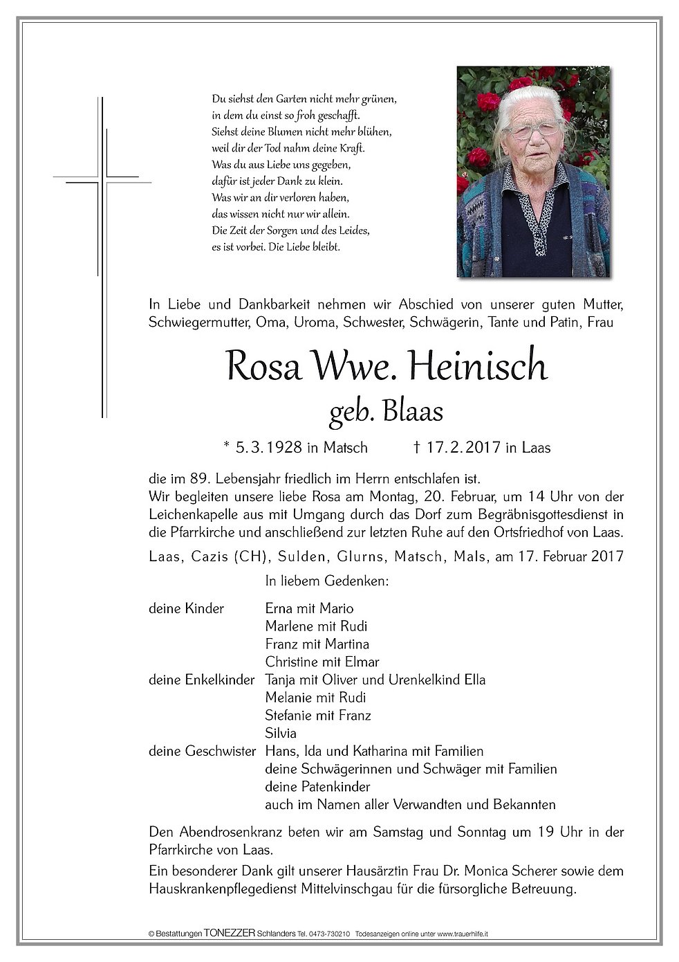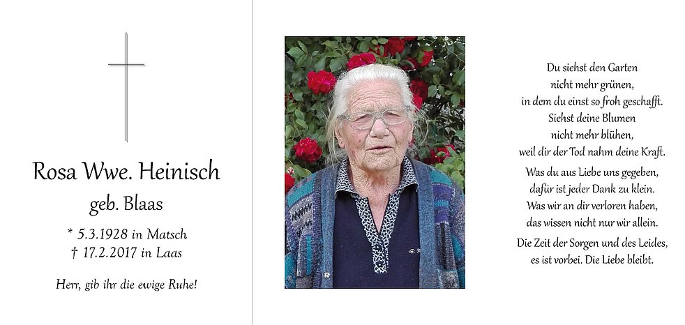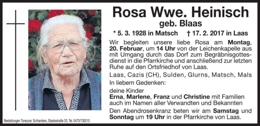 Wir begleiten unsere liebe Rosa am Montag, 20. Februar, um 14 Uhr von der Leichenkapelle aus mit Umgang durch das Dorf zum Begräbnisgottesdienst in die Pfarrkirche und anschließend zur letzten Ruhe auf den Ortsfriedhof von Laas.