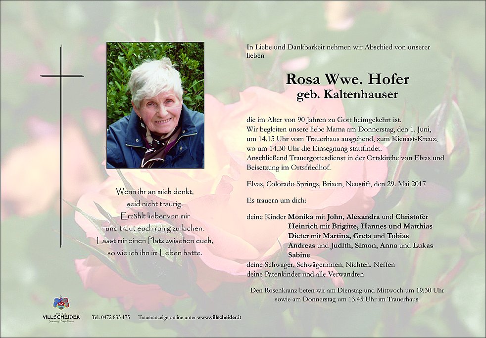 Den Rosenkranz beten wir am Dienstag und Mittwoch um 19.30 Uhr sowie am Donnerstag um 13.45 Uhr im Trauerhaus.