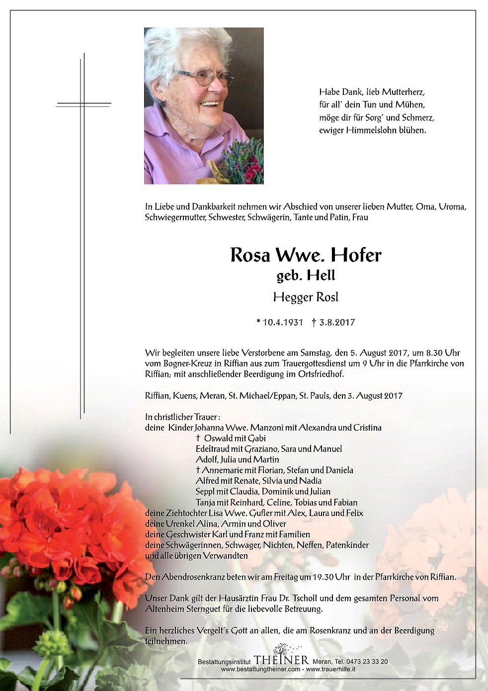 Wir begleiten unsere liebe Verstorbene am Samstag, den 5. August 2017, um 8.30 Uhr vom Bogner-Kreuz in Riffian aus zum Trauergottesdienst um 9 Uhr in die Pfarrkirche von Riffian; mit anschließender Beerdigung im Ortsfriedhof.