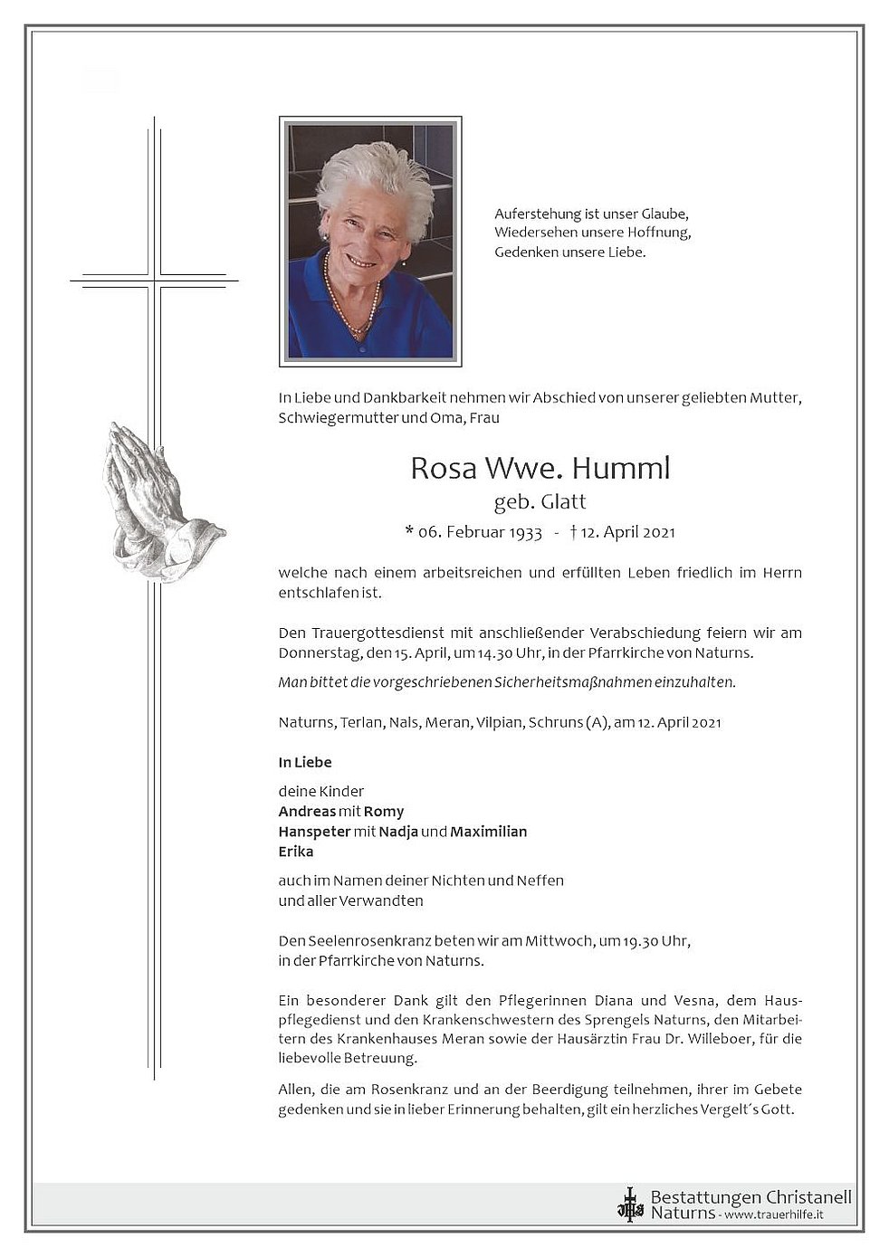 Den Trauergottesdienst mit anschließender Verabschiedung feiern wir am Donnerstag, den 15. April, um 14.30 Uhr, in der Pfarrkirche von Naturns.