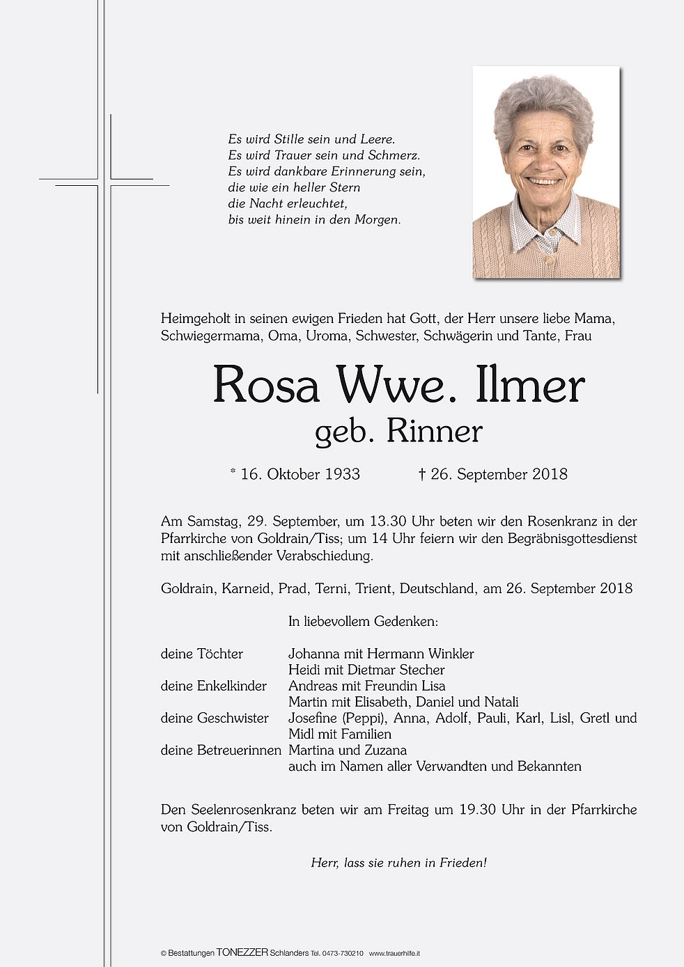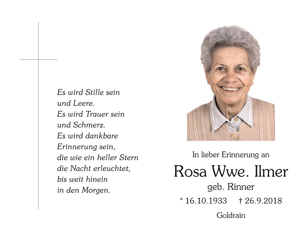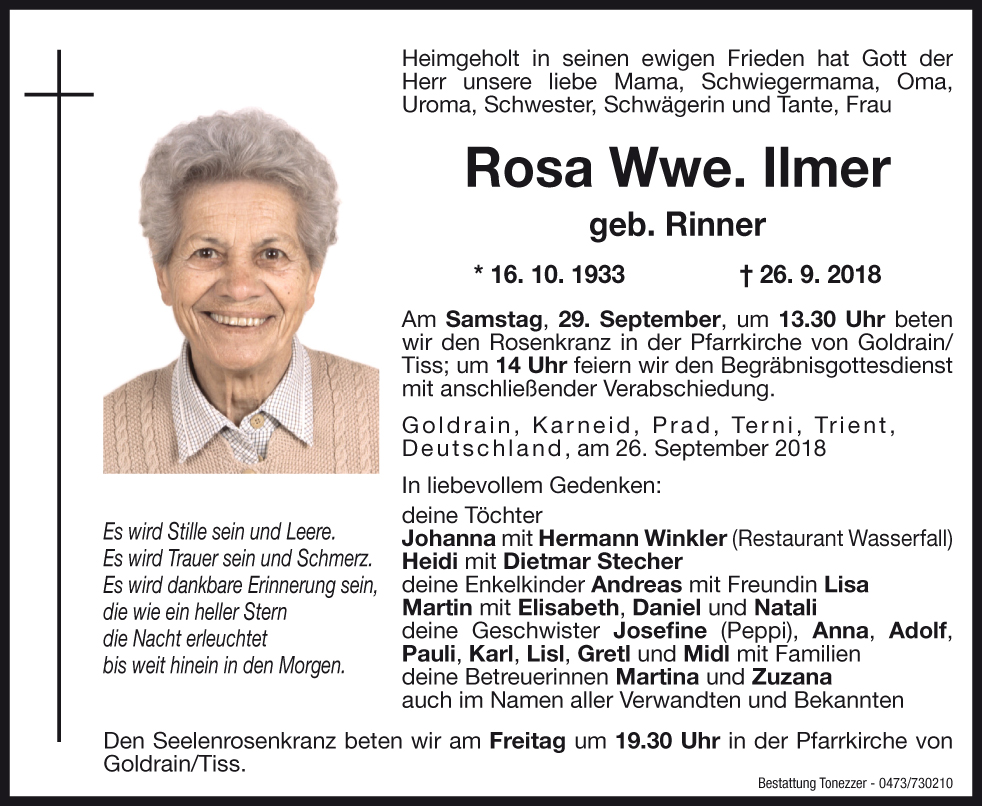 Am Samstag, 29. September, um 13.30 Uhr beten wir den Rosenkranz in der Pfarrkirche von Goldrain/Tiss; um 14 Uhr feiern wir den Begräbnisgottesdienst mit anschließender Verabschiedung.