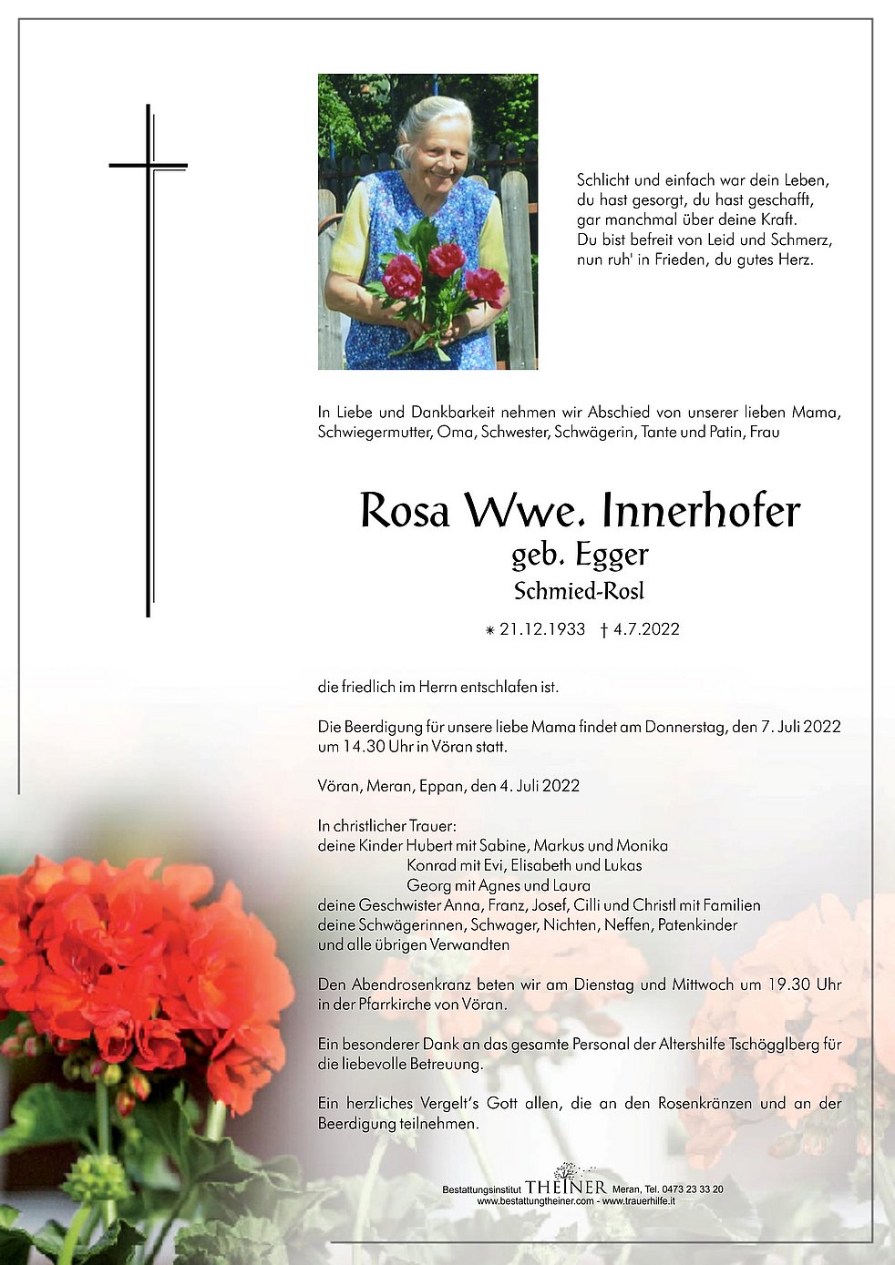 Die Beerdigung für unsere liebe Mama findet am Donnerstag, den 7. Juli 2022 um 14.30 Uhr in Vöran statt.