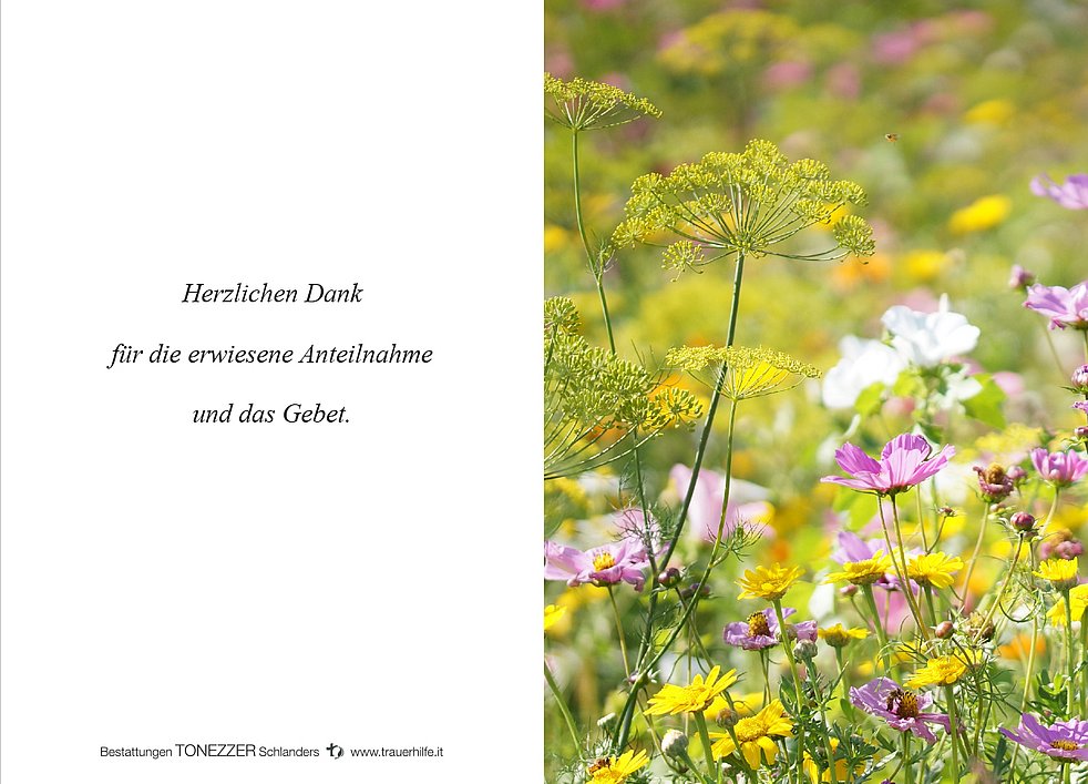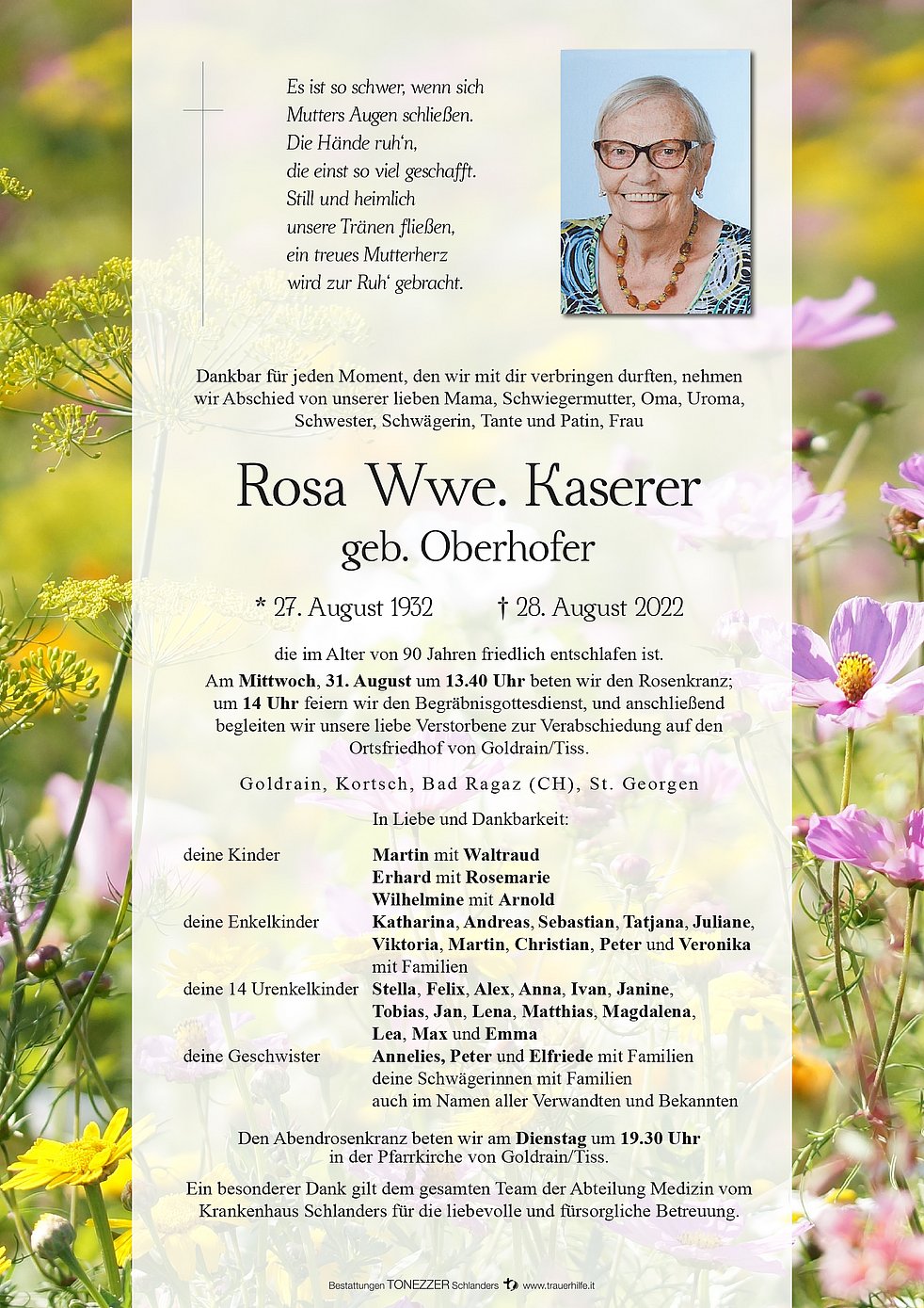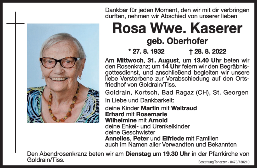 Am Mittwoch, 31. August um 13.40 Uhr beten wir den Rosenkranz; um 14 Uhr feiern wir den Begräbnisgottesdienst, und anschließend begleiten wir unsere liebe Verstorbene zur Verabschiedung auf den Ortsfriedhof von Goldrain/Tiss.