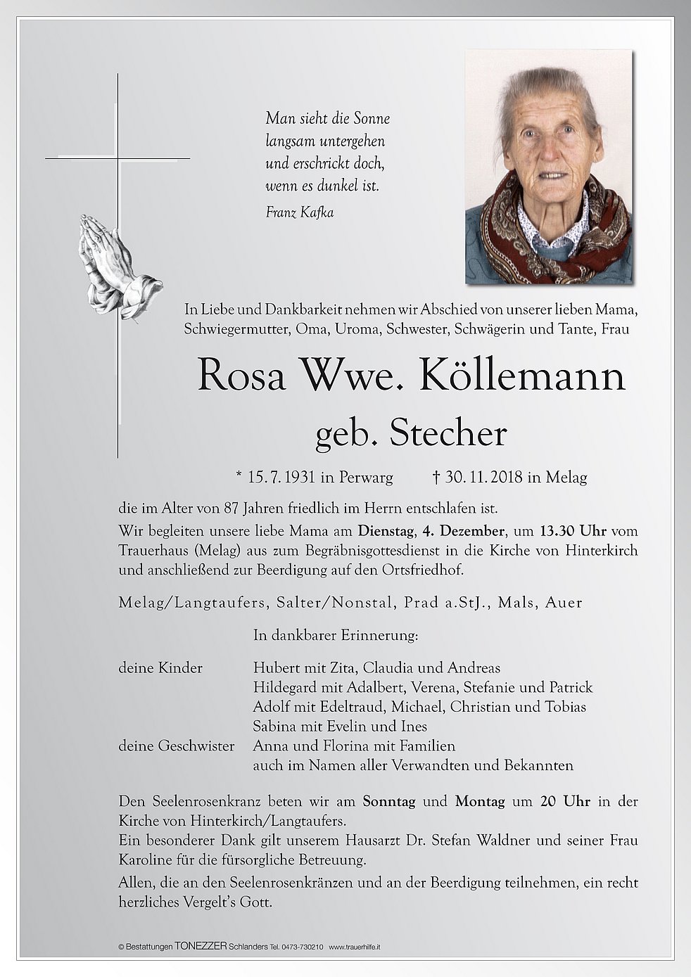 Wir begleiten unsere liebe Mama am Dienstag, 4. Dezember, um 13.30 Uhr vom Trauerhaus (Melag) aus zum Begräbnisgottesdienst in die Kirche von Hinterkirch und anschließend zur Beerdigung auf den Ortsfriedhof.