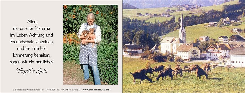 Ein herzliches Vergelt’s Gott gilt dem Hausarzt Herrn Dr. Elia Maglia sowie den Ärzten und dem Pflegepersonal der Abteilung Medizin am Krankenhaus Bruneck für die liebevolle Betreuung.