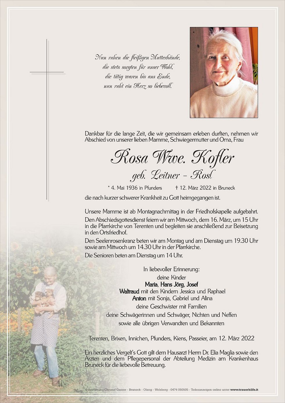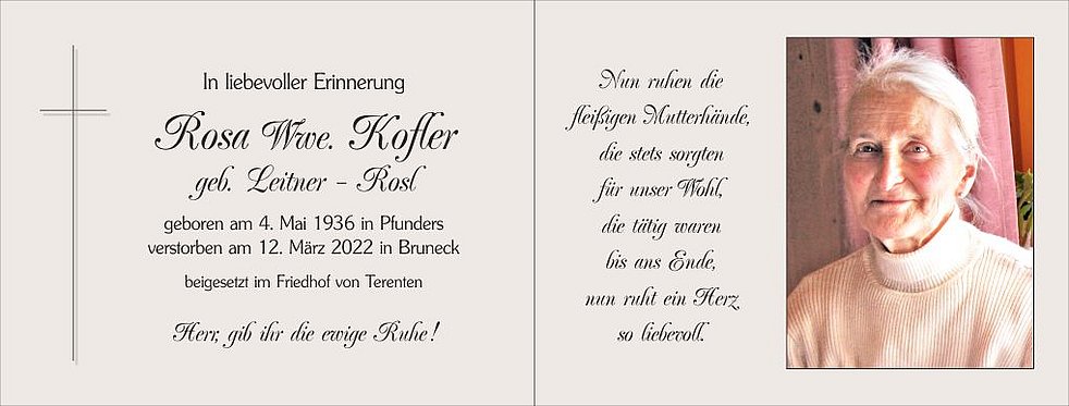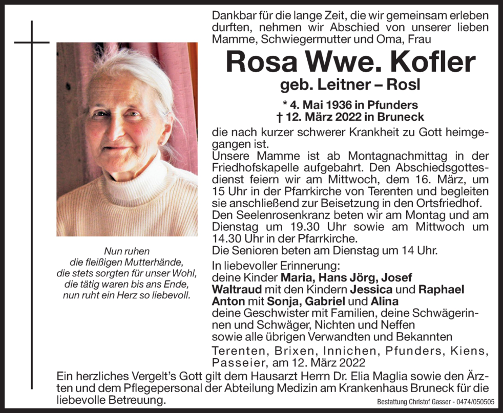 Den Abschiedsgottesdienst feiern wir am Mittwoch, dem 16. März, um 15 Uhr in die Pfarrkirche von Terenten und begleiten sie anschließend zur Beisetzung in den Ortsfriedhof.