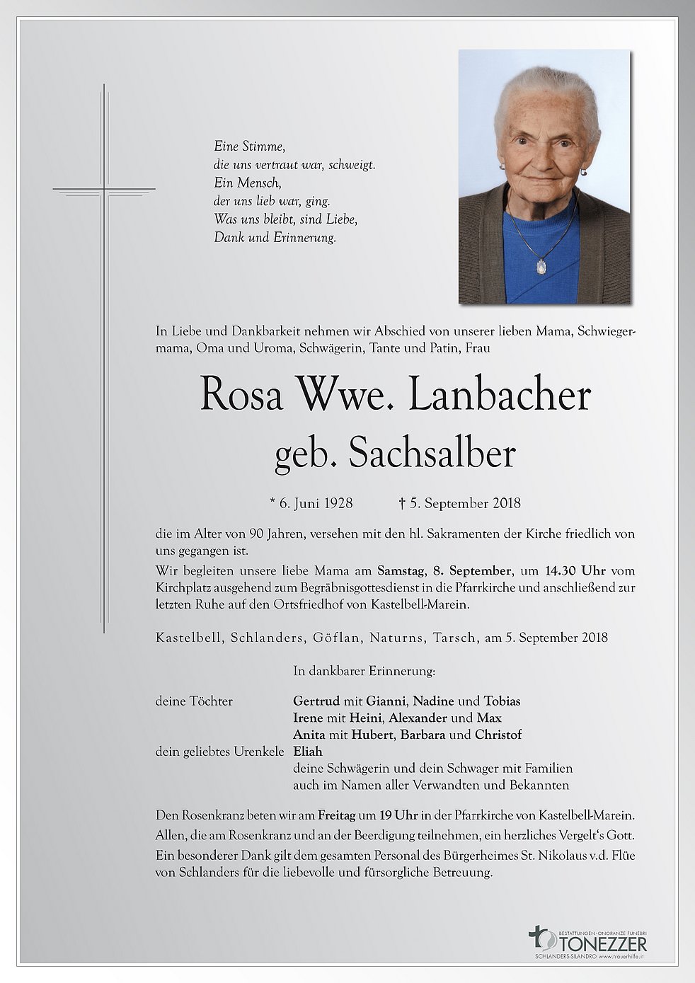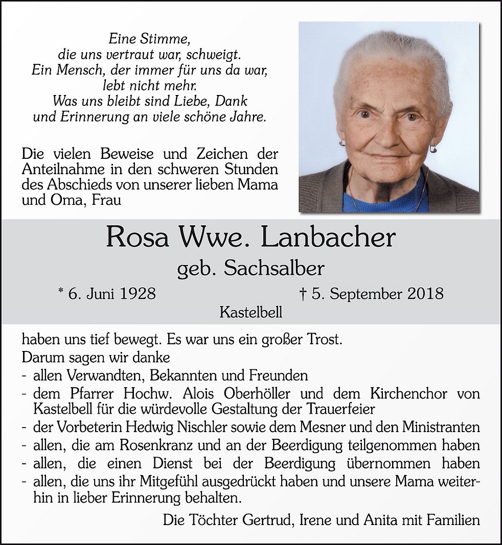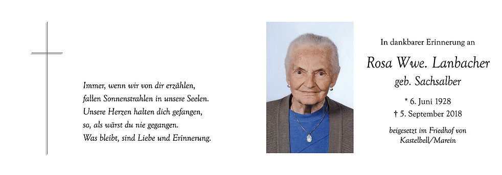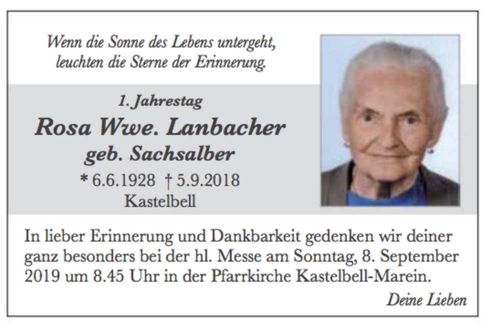 Wir begleiten unsere liebe Mama am Samstag, 8. September, um 14.30 Uhr vom Kirchplatz ausgehend zum Begräbnisgottesdienst in die Pfarrkirche und anschließend zur letzten Ruhe auf den Ortsfriedhof von Kastelbell-Marein.