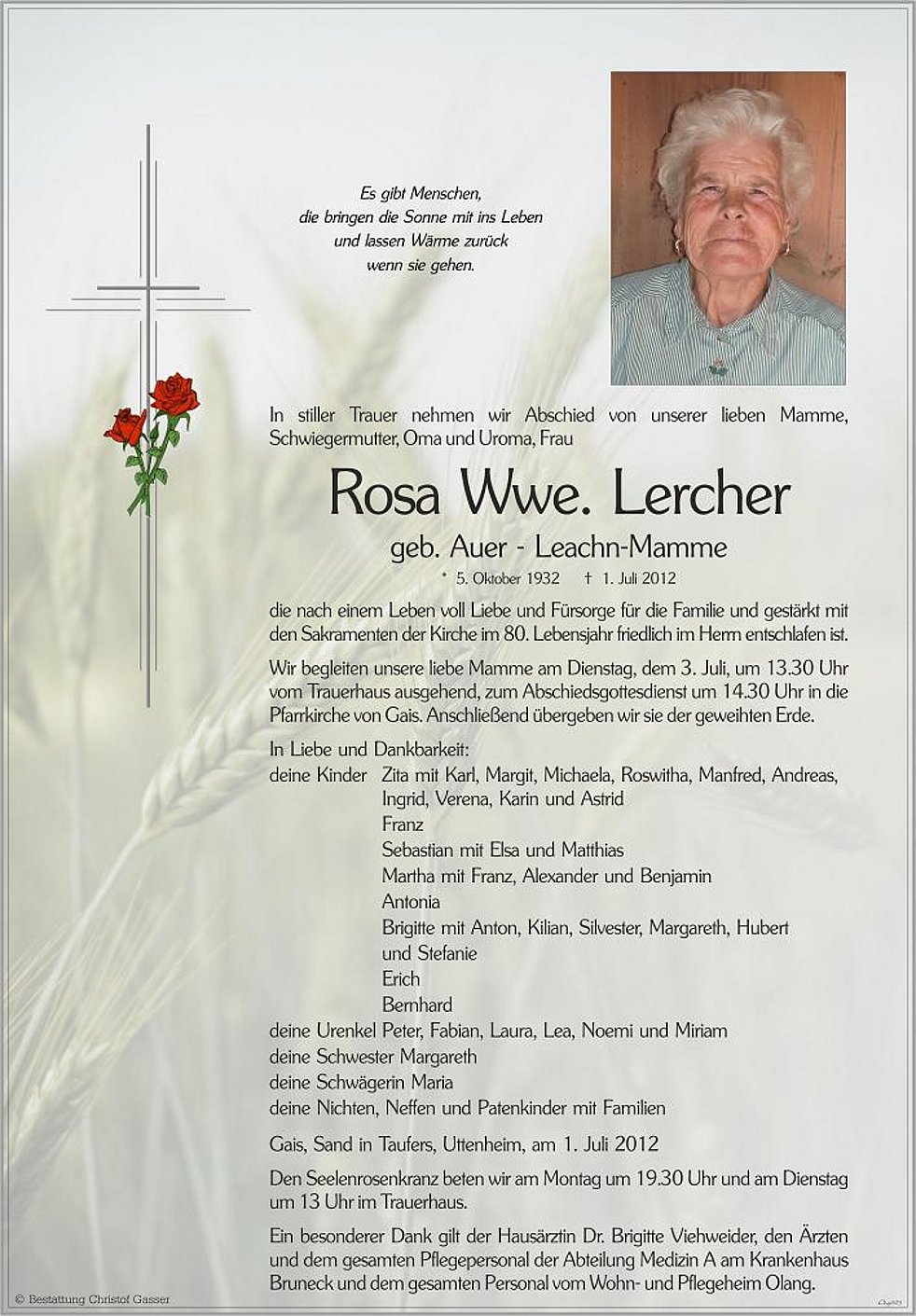 Wir begleiten unsere liebe Mamme am Dienstag, dem 3. Juli, um 13.30 Uhr vom Trauerhaus ausgehend, zum Abschiedsgottesdienst um 14.30 Uhr in die Pfarrkirche von Gais. Anschließend übergeben wir sie der geweihten Erde.