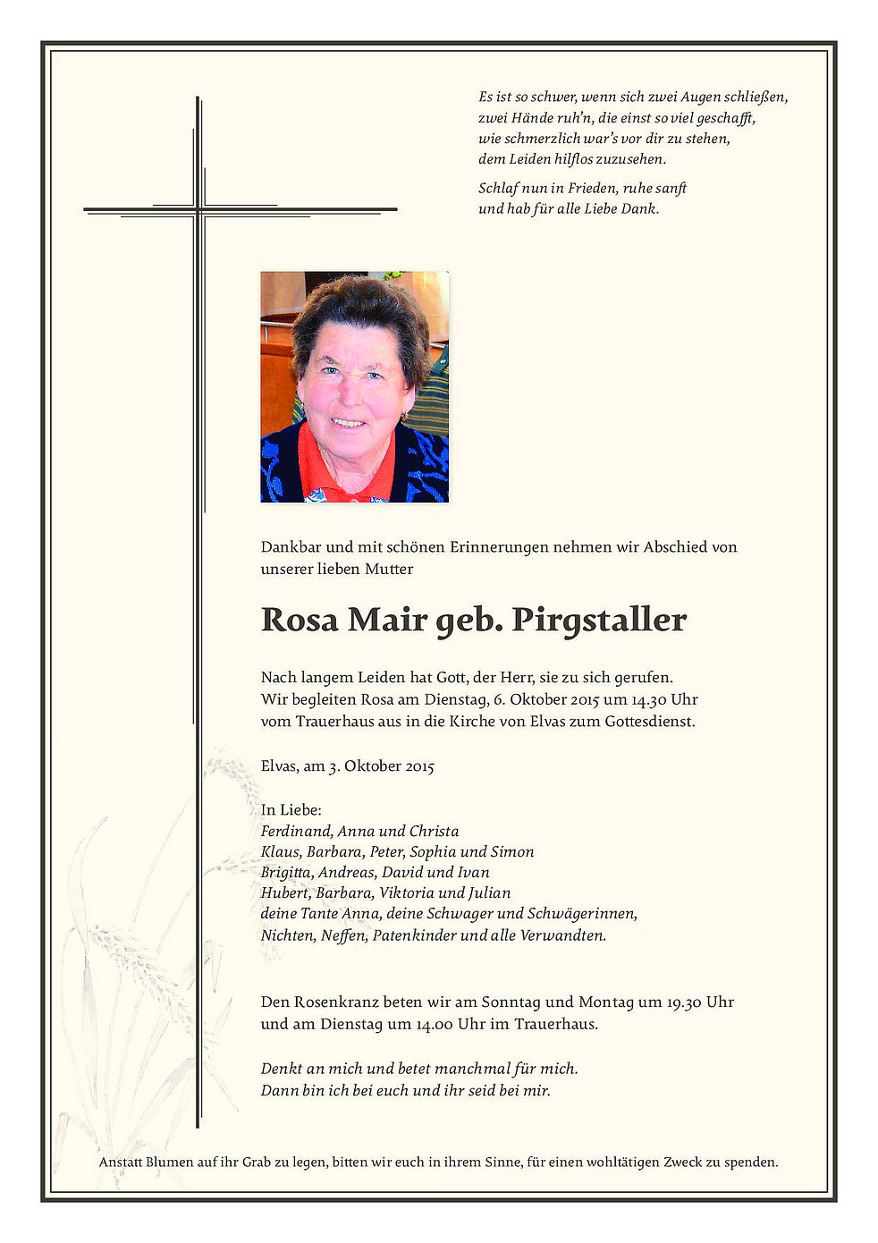 Dankbar und mit schönen Erinnerungen nehmen wir Abschied von unserer lieben Mutter