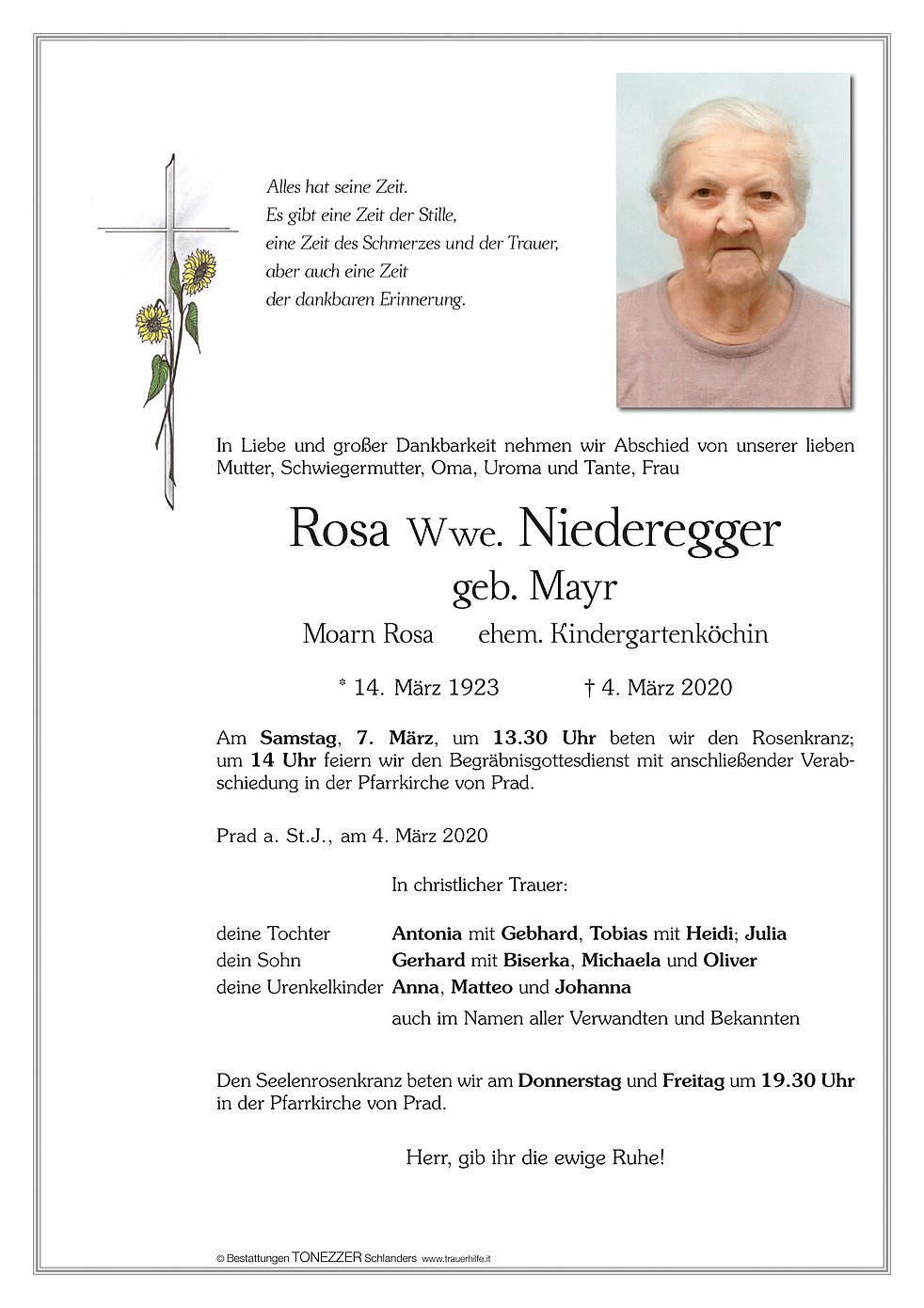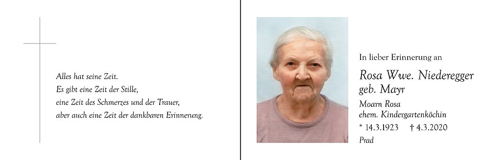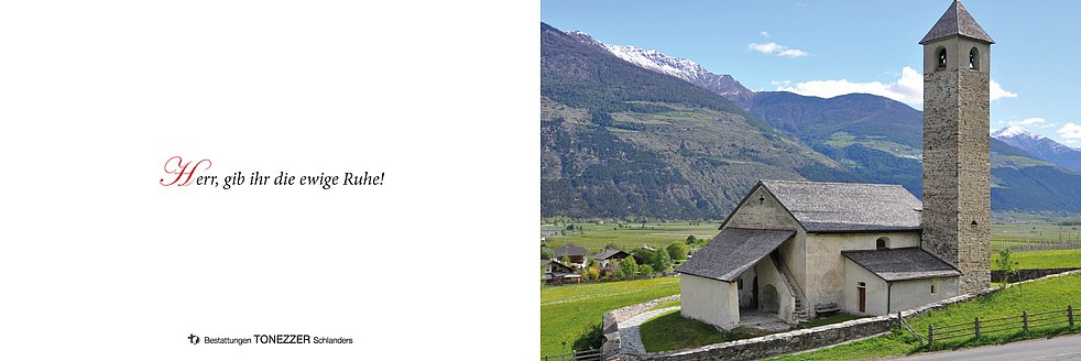 Am Samstag, 7. März, um 13.30 Uhr beten wir den Rosenkranz; um 14 Uhr feiern wir den Begräbnisgottesdienst mit anschließender Verabschiedung in der Pfarrkirche von Prad.