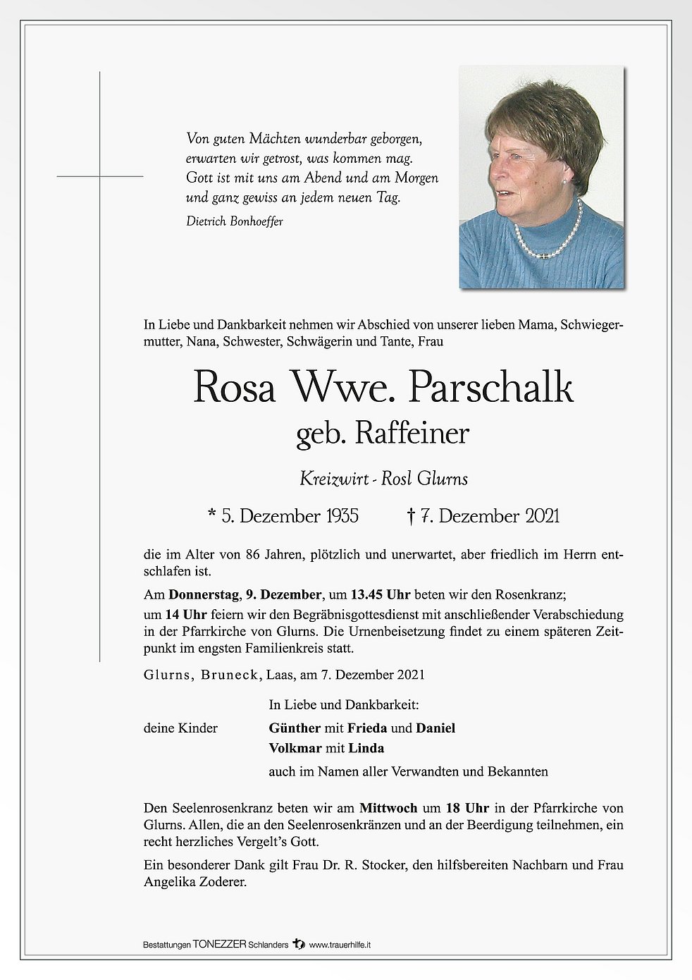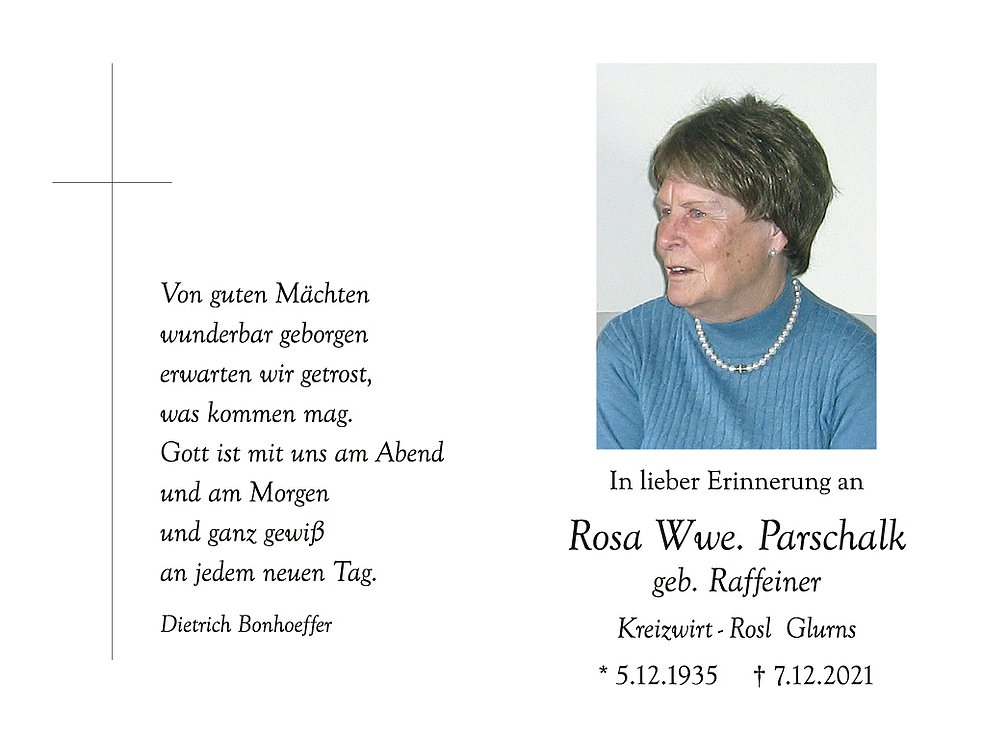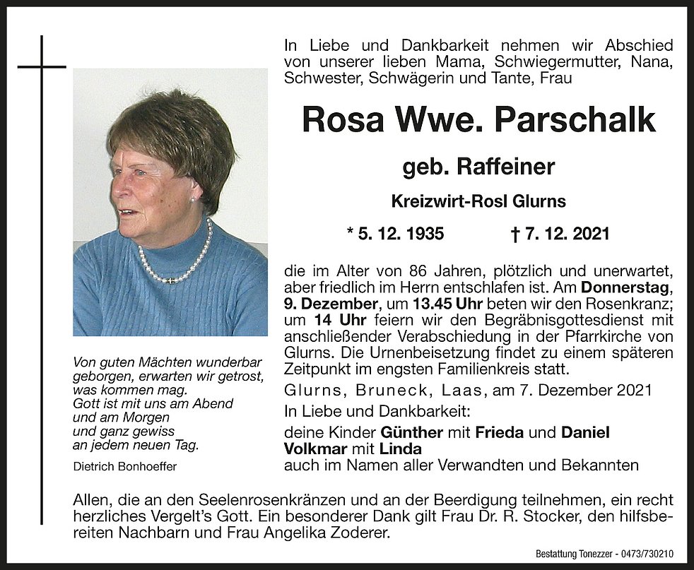 Am Donnerstag, 9. Dezember, um 13.45 Uhr beten wir den Rosenkranz; um 14 Uhr feiern wir den Begräbnisgottesdienst mit anschließender Verabschiedung in der Pfarrkirche von Glurns.