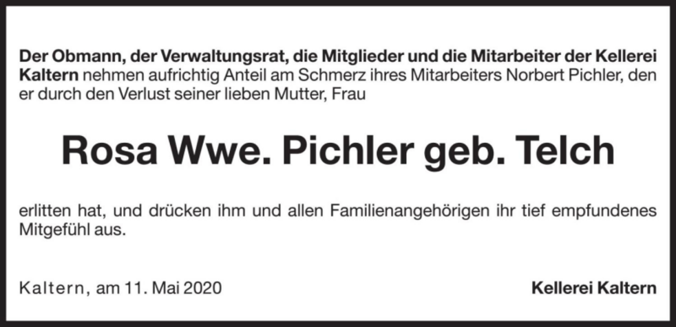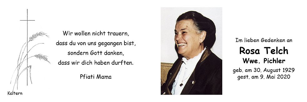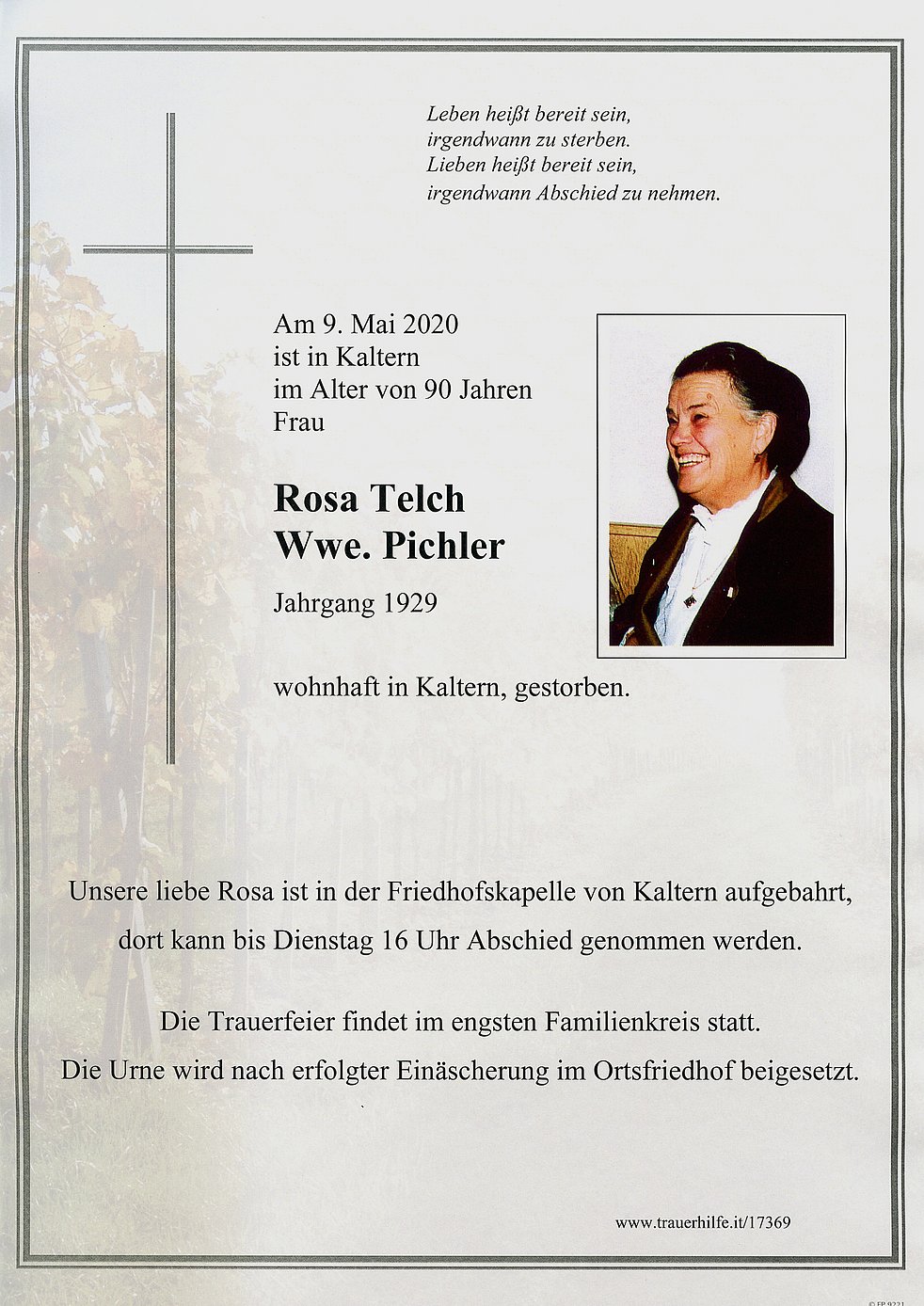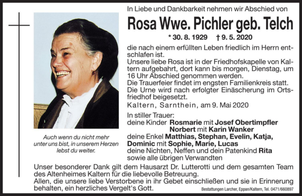 Unsere liebe Rosa ist in der Friedhofskapelle von Kaltern aufgebahrt, dort kann bis Dienstag 16 Uhr Abschied genommen werden.