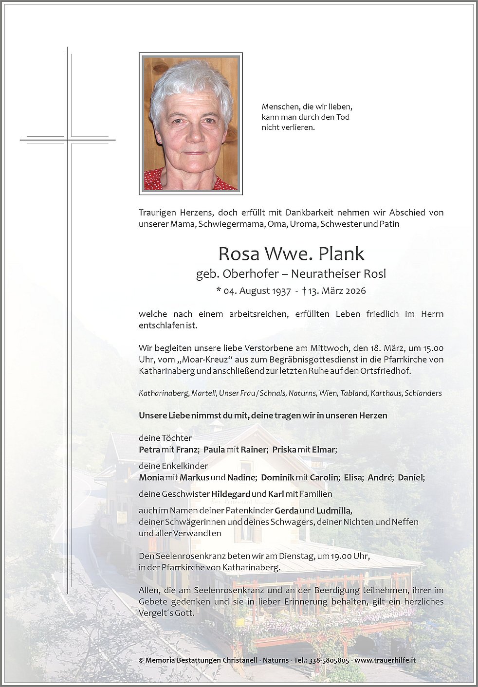Wir begleiten unsere liebe Verstorbene am Mittwoch, den 18. März, um 15.00 Uhr, vom „Moar-Kreuz“ aus zum Begräbnisgottesdienst in die Pfarrkirche von Katharinaberg und anschließend zur letzten Ruhe auf den Ortsfriedhof.