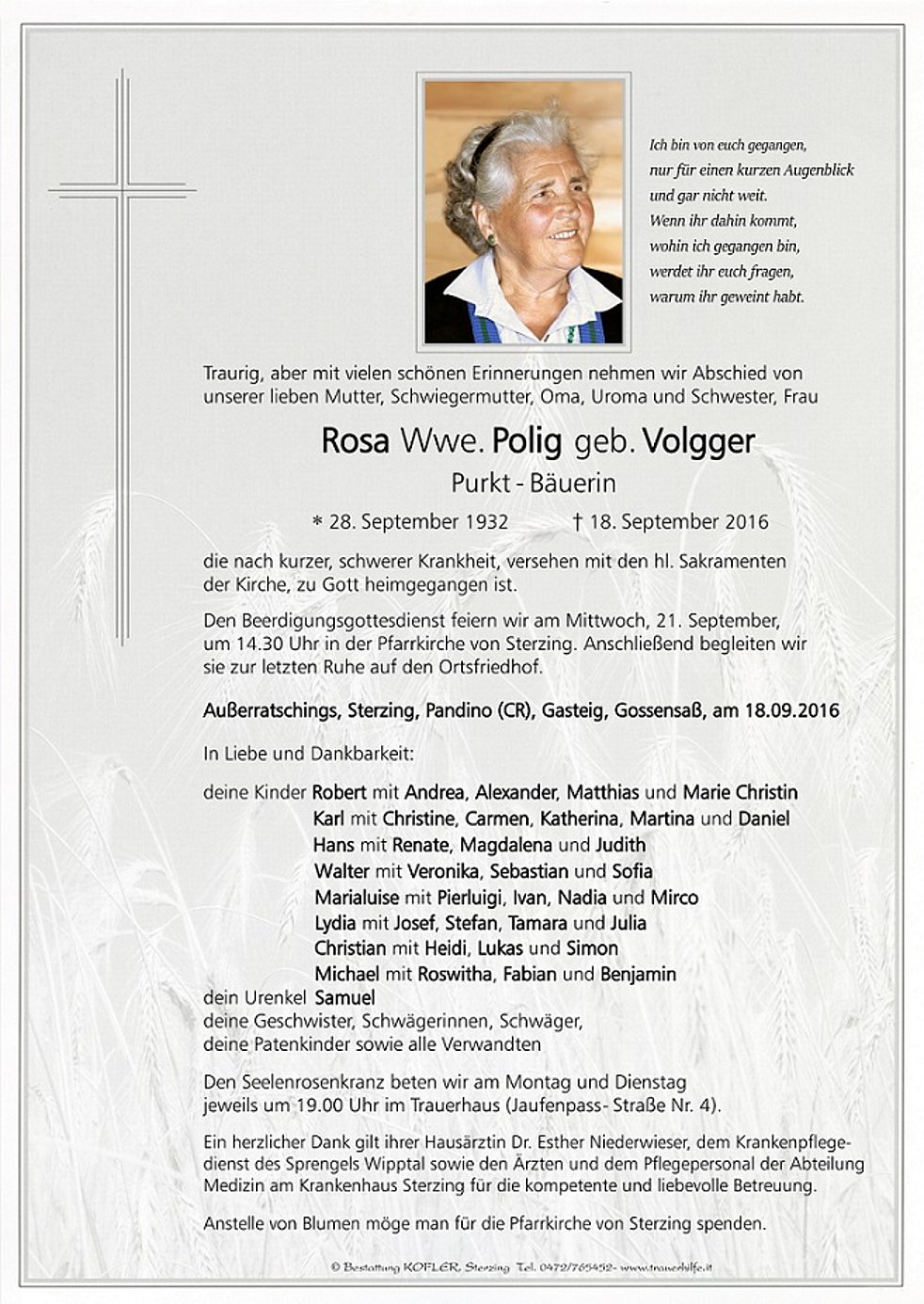 Den Beerdigungsgottesdienst feiern wir am Mittwoch, 21. September, um 14.30 Uhr in der Pfarrkirche von Sterzing. Anschließend begleiten wir sie zur letzten Ruhe auf den Ortsfriedhof.