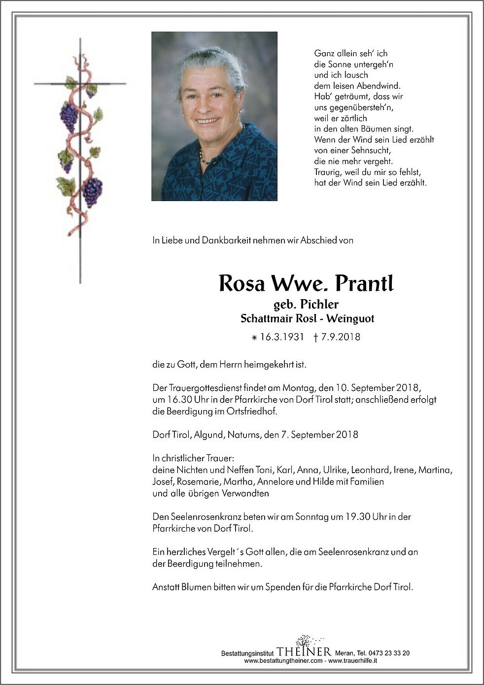 Der Trauergottesdienst findet am Montag, den 10. September 2018, um 16.30 Uhr in der Pfarrkirche von Dorf Tirol statt; anschließend erfolgt die Beerdigung im Ortsfriedhof.