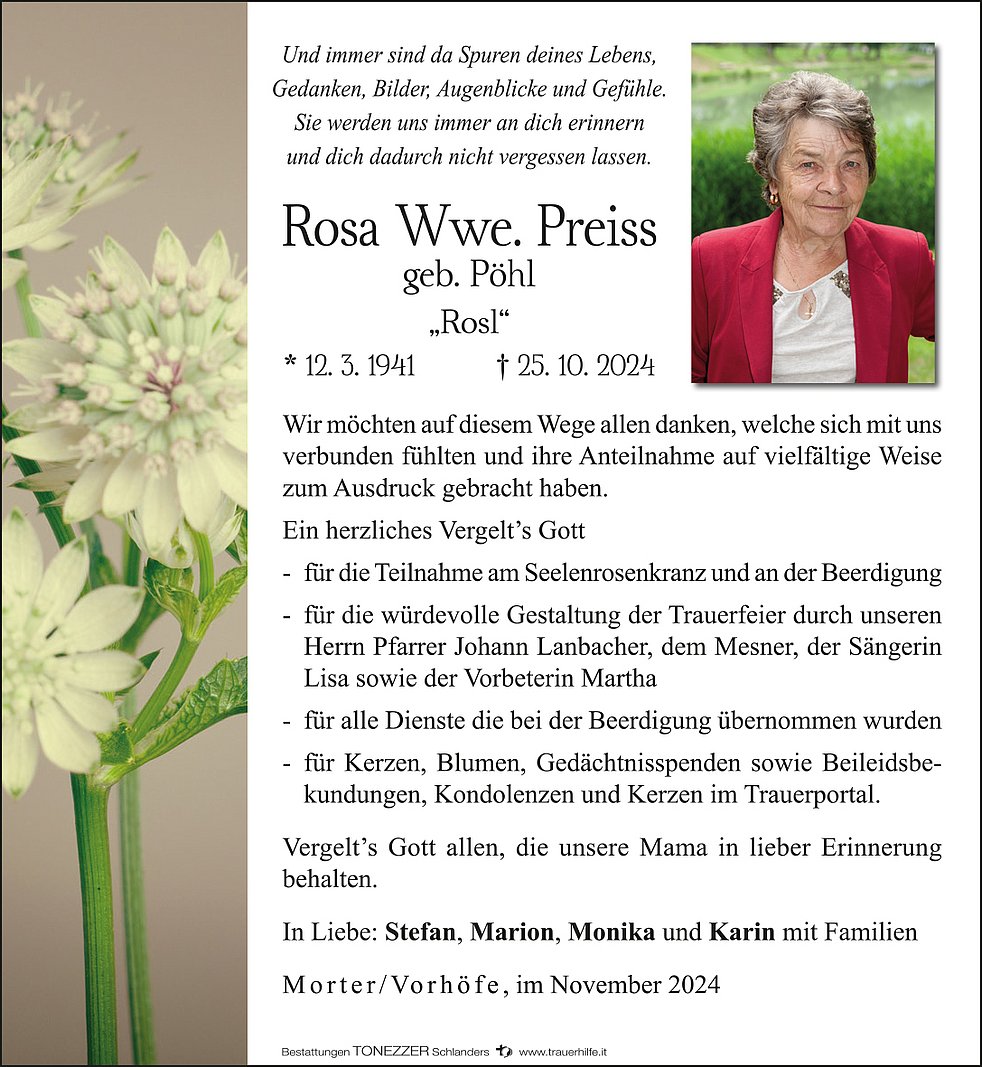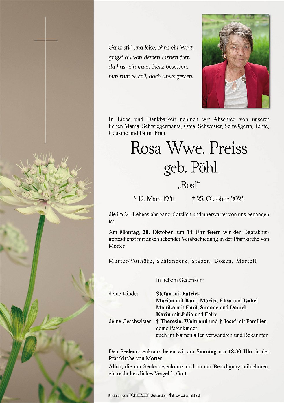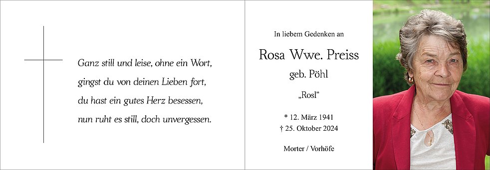 Wir drücken allen Angehörigen unser aufrichtiges und herzliches Beleid aus. Möge die Erinnerung an alles gemeinsame Schöne helfen, die Trauer zu überwinden. Der Tod ist die Grenze des Lebens, nicht aber der Liebe. Ruhe in Frieden Rosa, das ewige Licht möge dir leuchten und deinen Lieben Kraft geben.