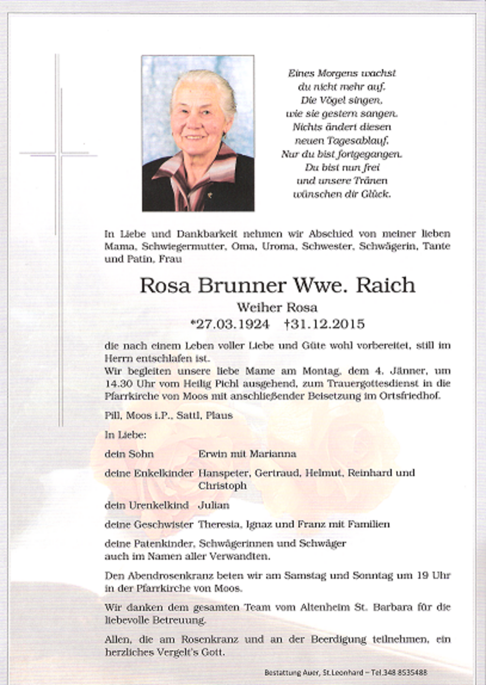 Wir begleiten unsere liebe Mame am Montag, dem 4. Jänner, um 14.30 Uhr vom Heilig Pichl ausgehend, zum Trauergottesdienst in die Pfarrkirche von Moos mit anschließender Beisetzung im Ortsfriedhof.