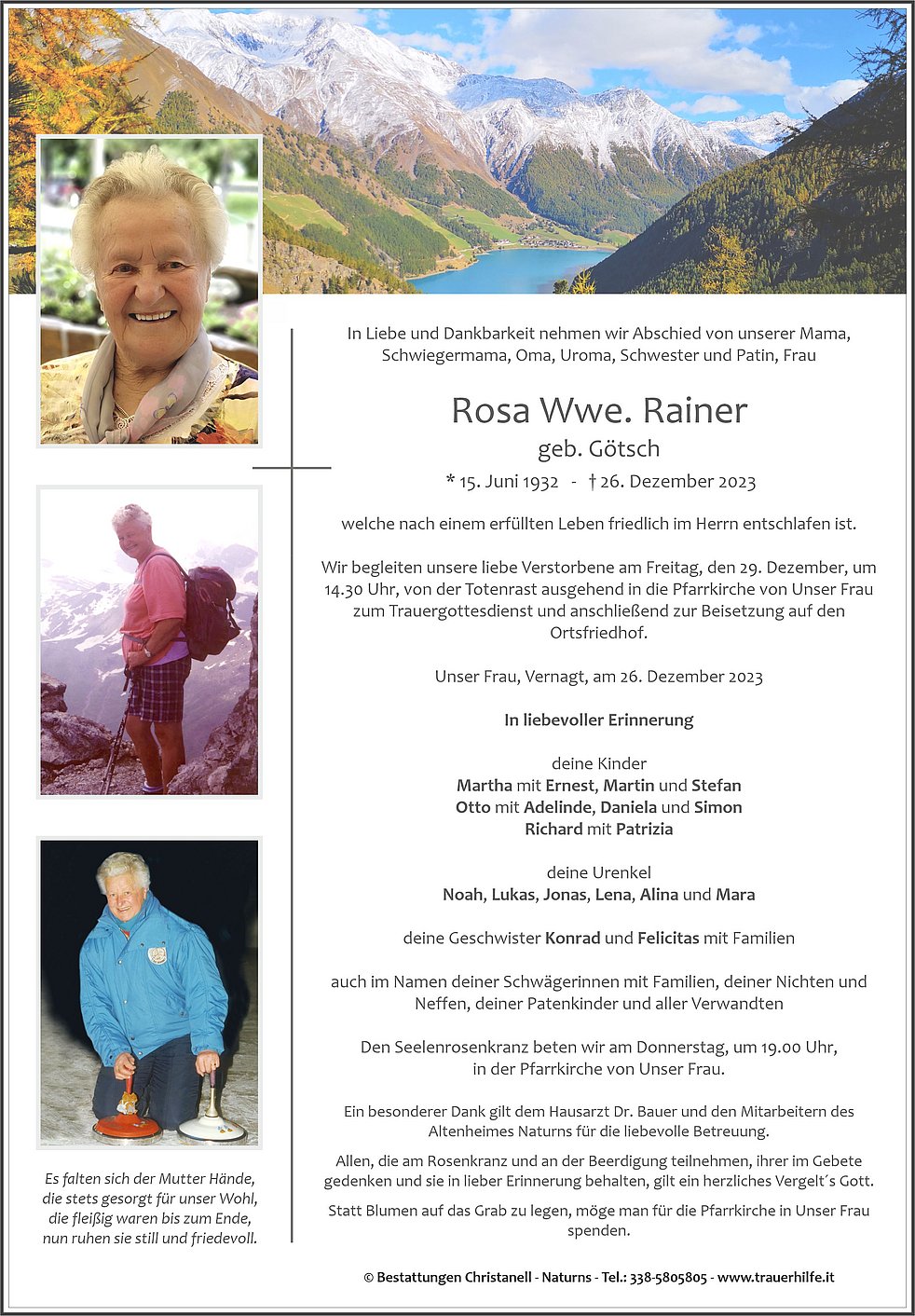 Wir begleiten unsere liebe Verstorbene am Freitag, den 29. Dezember, um 14.30 Uhr, von der Totenrast ausgehend in die Pfarrkirche von Unser Frau zum Trauergottesdienst und anschließend zur Beisetzung auf den Ortsfriedhof.