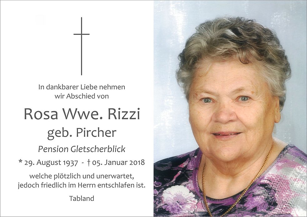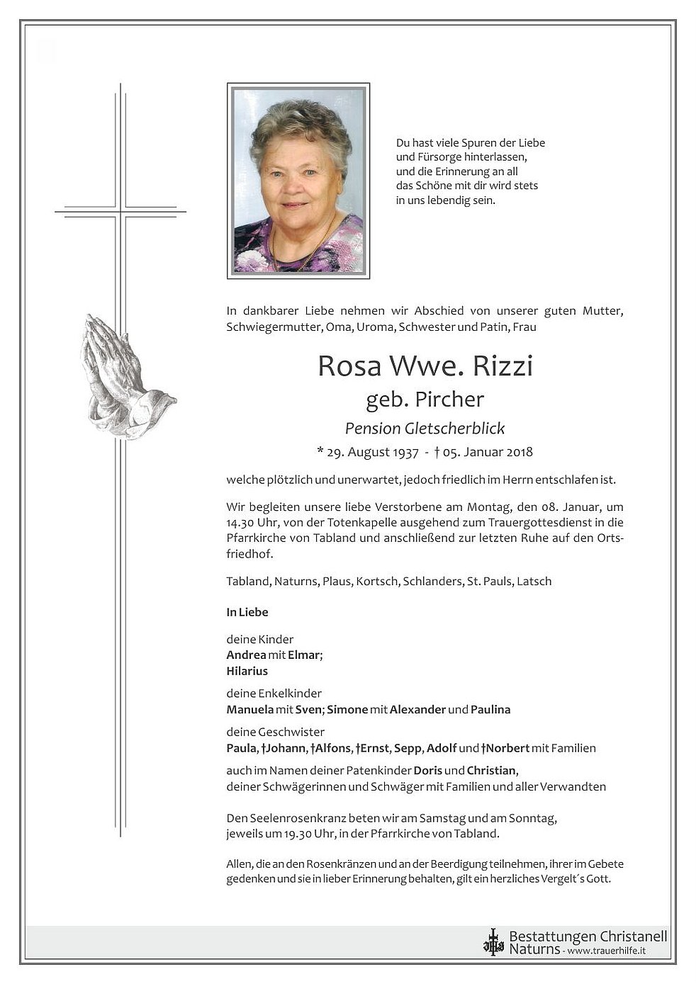 Wir begleiten unsere liebe Verstorbene am Montag, den 08. Januar, um 14.30 Uhr, von der Totenkapelle ausgehend zum Trauergottesdienst in die Pfarrkirche von Tabland und anschließend zur letzten Ruhe auf den Ortsfriedhof.