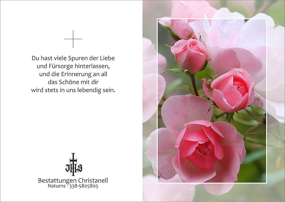 Allen, die an den Rosenkränzen und an der Beerdigung teilnehmen, ihrer im Gebete gedenken und sie in lieber Erinnerung behalten, gilt ein herzliches Vergelt´s Gott.