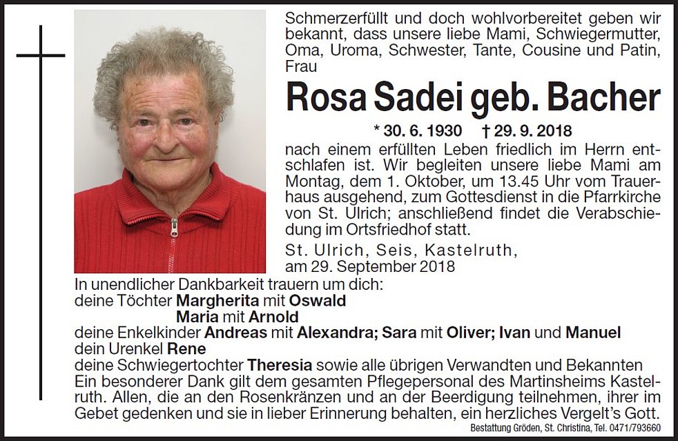 Wir begleiten unsere liebe Mami am Montag, dem 01. Oktober, um 13.45 Uhr vom Trauerhaus ausgehend, zum Gottesdienst in die Pfarrkirche von St. Ulrich; anschließend findet die Verabschiedung im Ortsfriedhof statt.