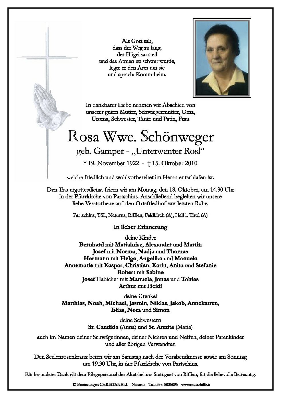 Den Trauergottesdienst feiern wir am Montag, den 18. Oktober, um 14.30 Uhr in der Pfarrkirche von Partschins. Anschließend begleiten wir unsere liebe Verstorbene auf den Ortsfriedhof zur letzten Ruhe.