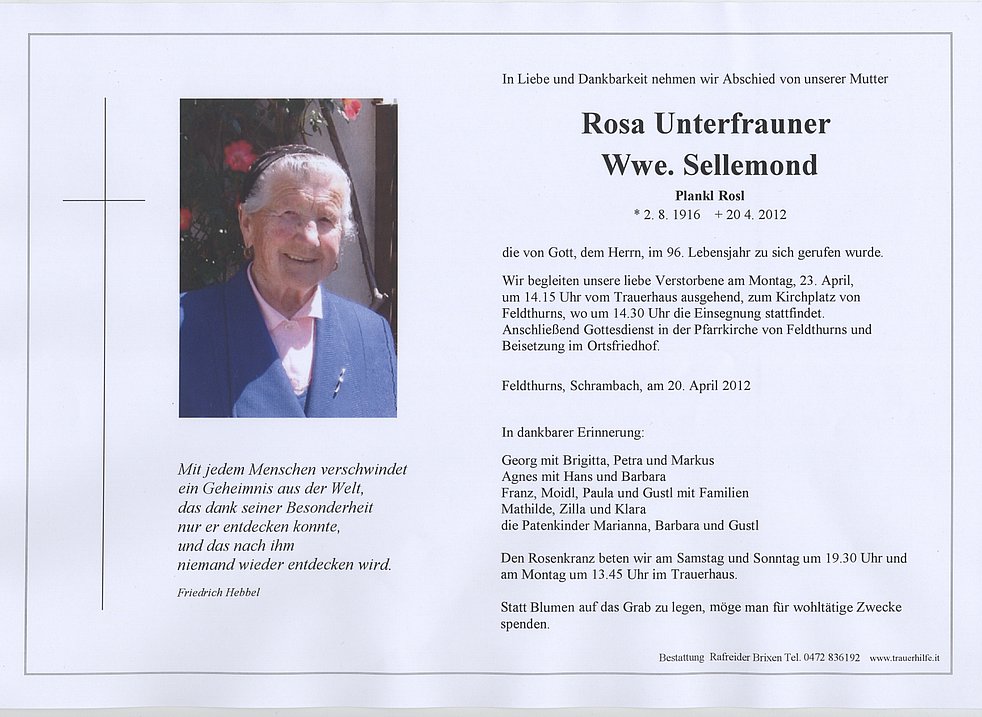 Wir begleiten unsere liebe Verstorbene am Montag, 23. April, um 14.15 Uhr vom Trauerhaus ausgehend, zum Kirchplatz von Feldthurns, wo um 14.30 Uhr die Einsegnung stattfindet.