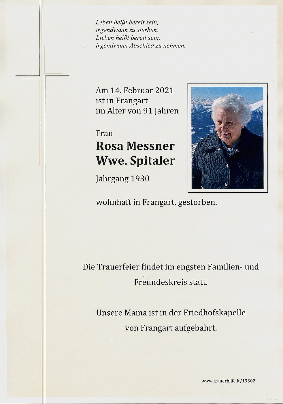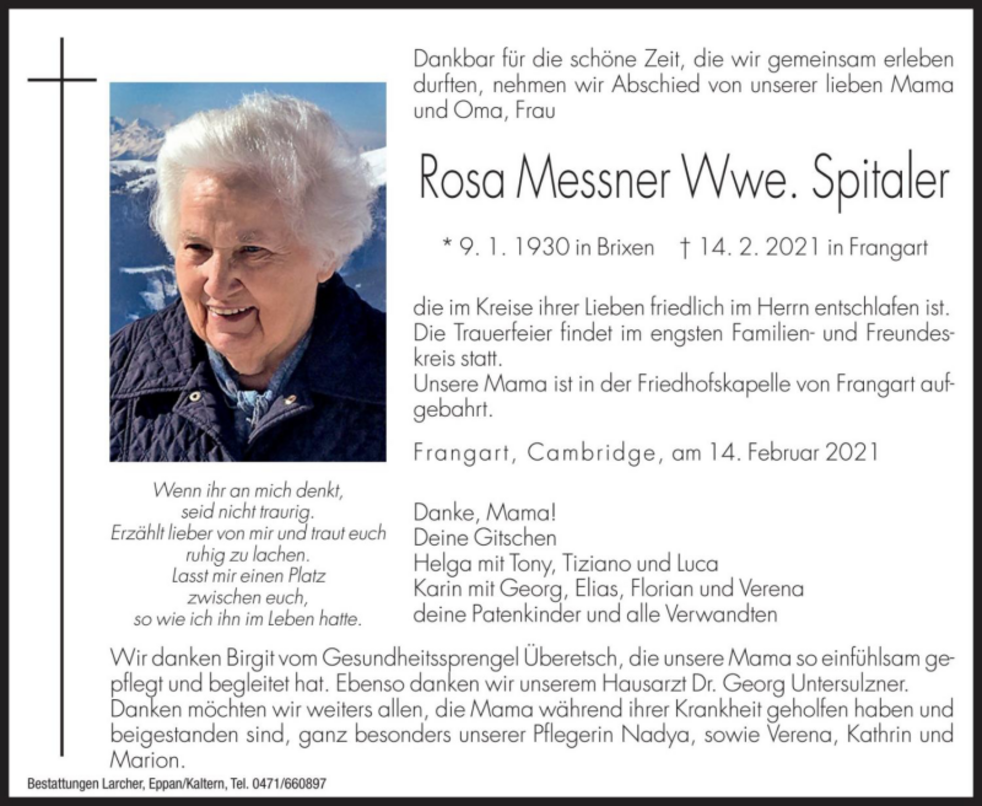 Wir danken Birgit vom Gesundheitssprengel Überetsch, die unsere Mama so einfühlsam gepflegt und begleitet hat. Ebenso danken wir unserem Hausarzt Dr. Georg Untersulzner. Danken möchten wir weiters allen, die Mama während ihrer Krankheit geholfen haben und beigestanden sind, ganz besonders unserer Pflegerin Nadya, sowie Verena, Kathrin und Marion.