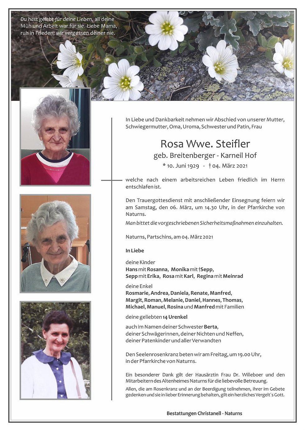 Den Trauergottesdienst mit anschließender Einsegnung feiern wir am Samstag, den 06. März, um 14.30 Uhr, in der Pfarrkirche von Naturns.
