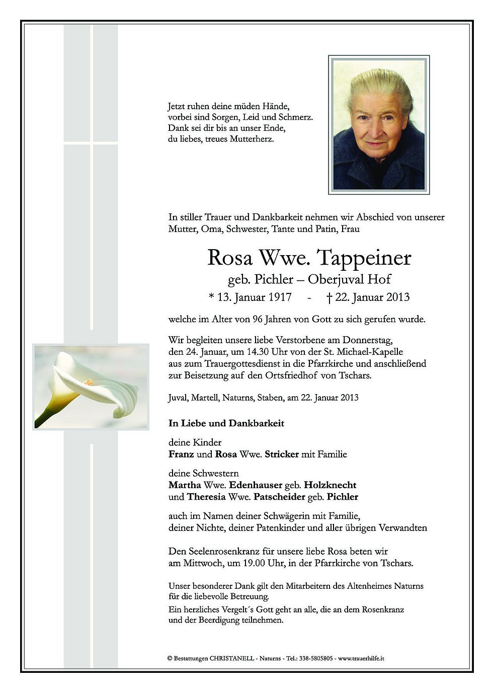 Wir begleiten unsere liebe Verstorbene am Donnerstag, den 24. Januar, um 14.30 Uhr von der St. Michael-Kapelle aus zum Trauergottesdienst in die Pfarrkirche und anschließend zur Beisetzung auf den Ortsfriedhof von Tschars.