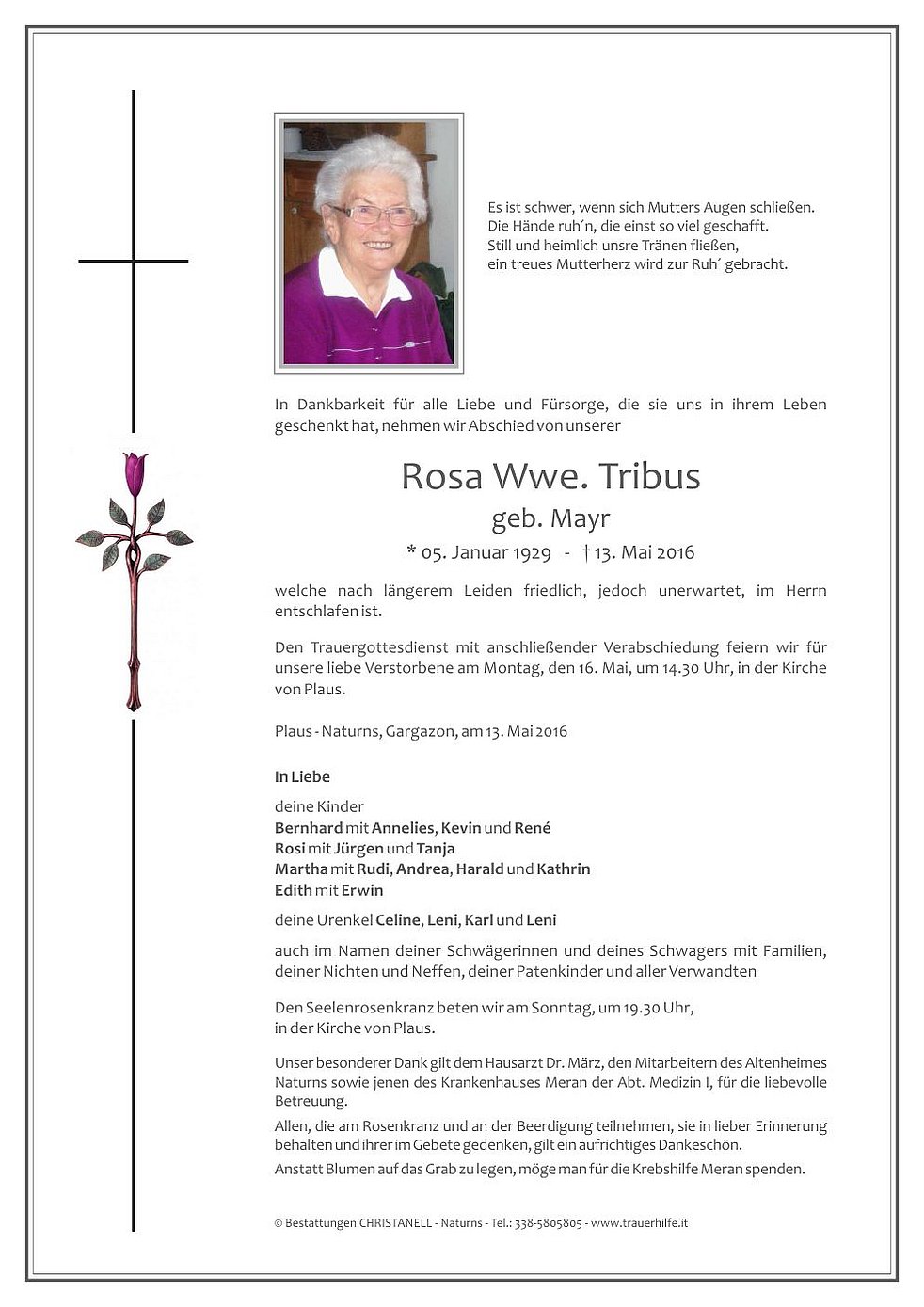Anstatt Blumen auf das Grab zu legen, möge man für die Krebshilfe Meran spenden.