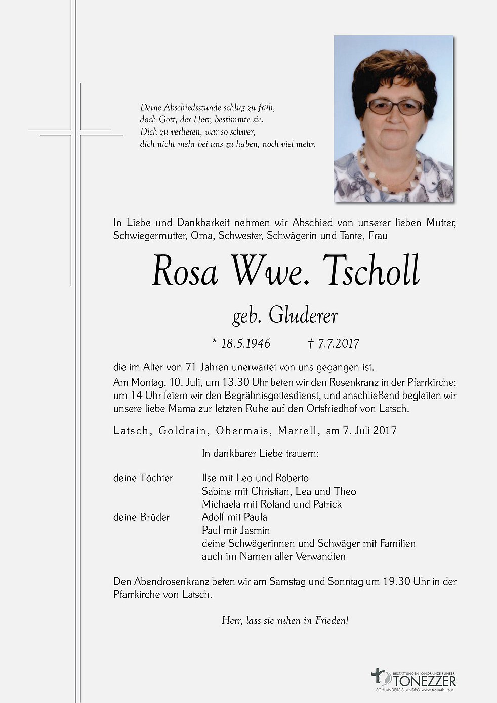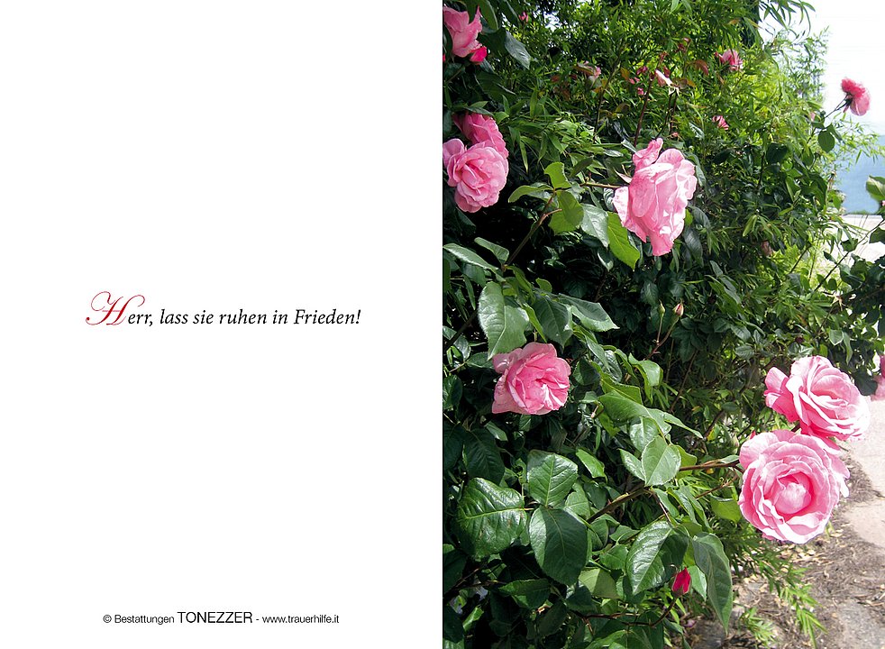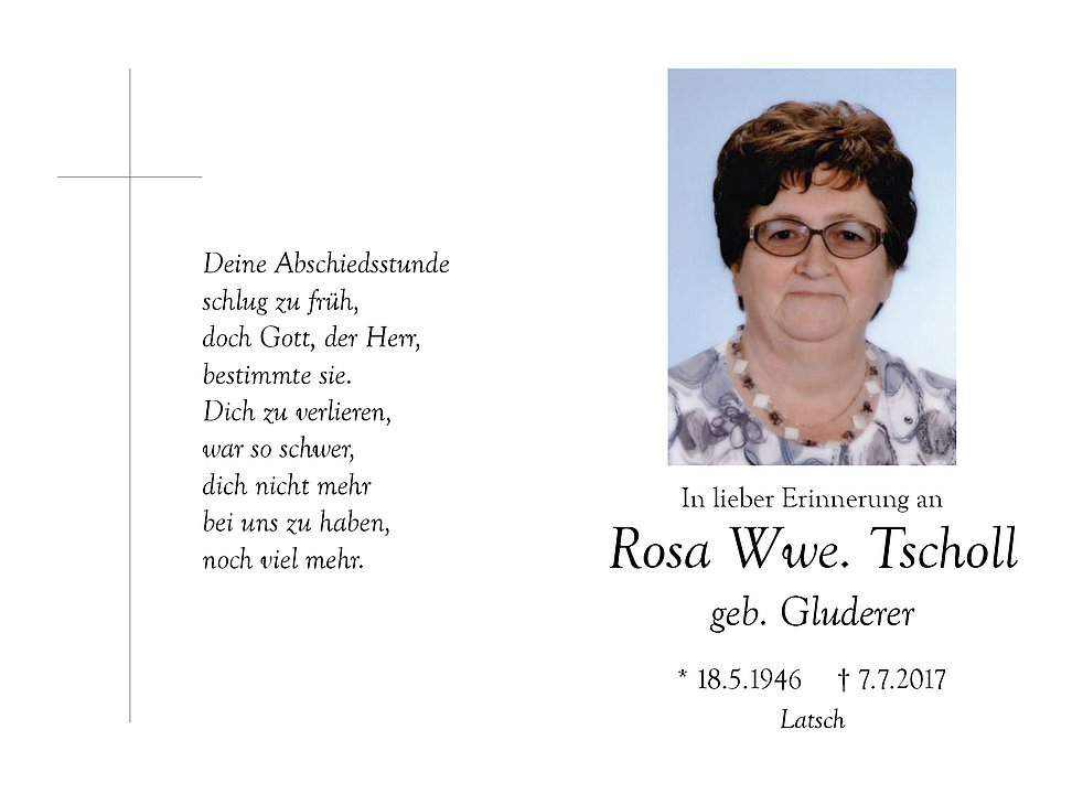 Am Montag, 10. Juli, um 13.30 Uhr beten wir den Rosenkranz in der Pfarrkirche; um 14 Uhr feiern wir den Begräbnisgottesdienst, und anschließend begleiten wir unsere liebe Mama zur letzten Ruhe auf den Ortsfriedhof von Latsch.