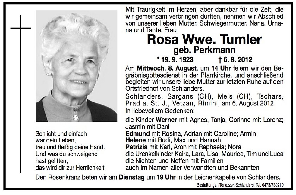 Am Mittwoch, 8. August, um 14 Uhr feiern wir den Begräbnisgottesdienst in der Pfarrkirche und anschließend begleiten wir unsere liebe Mutter zur letzten Ruhe auf den Ortsfriedhof von Schlanders.