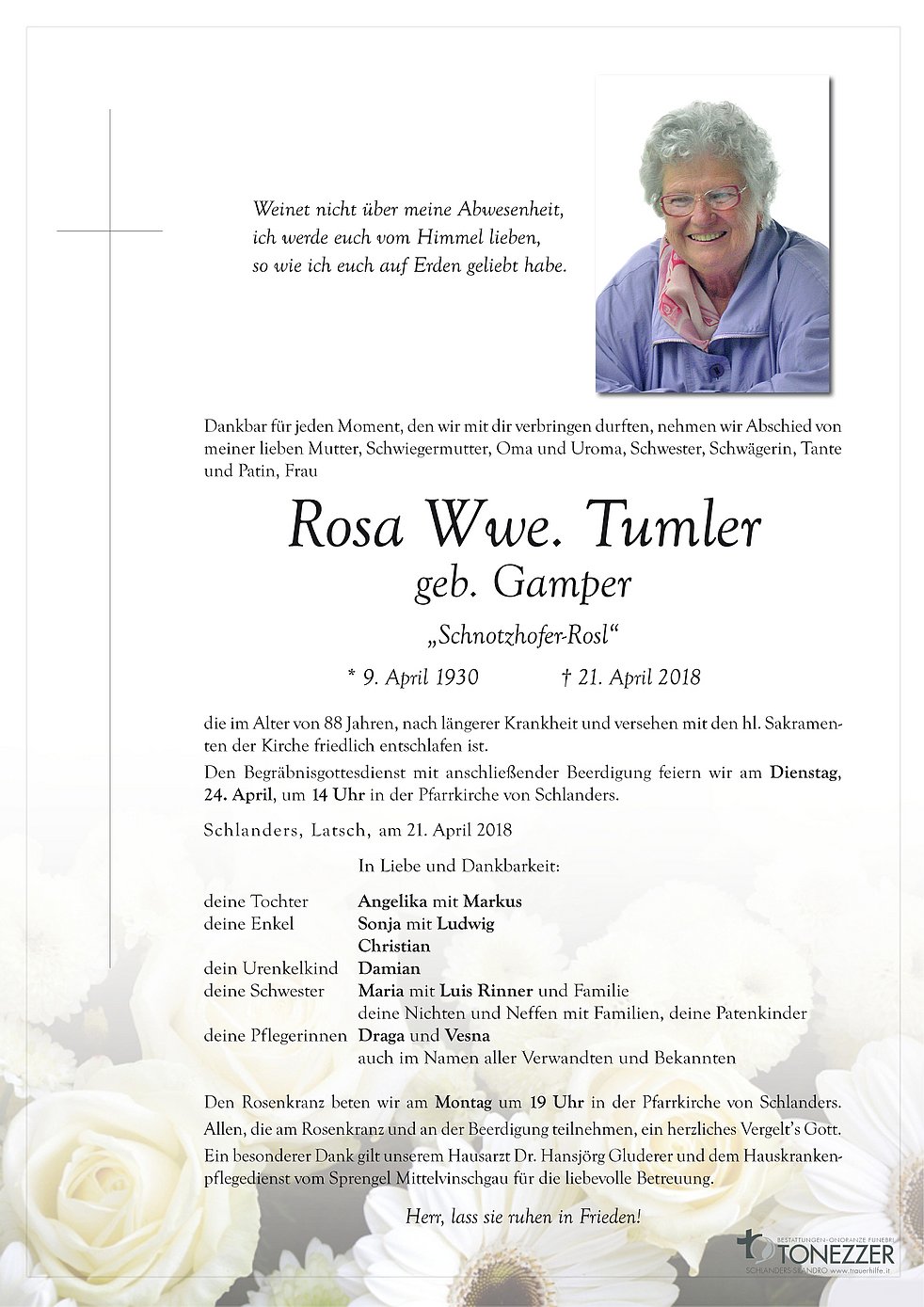 Den Begräbnisgottesdienst mit anschließender Beerdigung feiern wir am Dienstag, 24. April, um 14 Uhr in der Pfarrkirche von Schlanders.