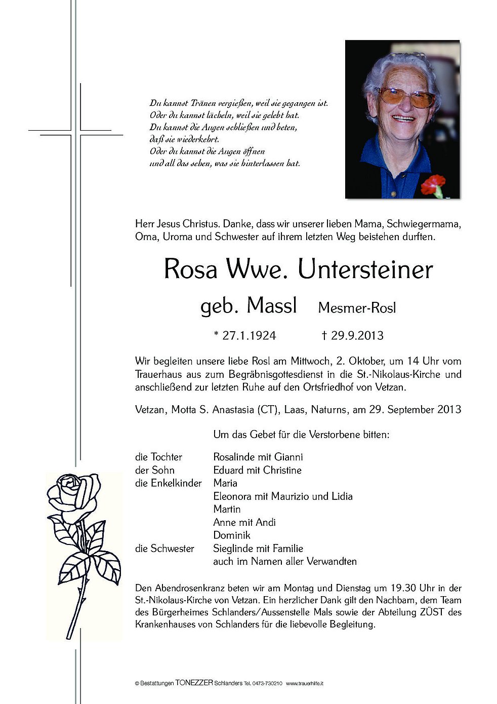Wir begleiten unsere liebe Rosl am Mittwoch, 2. Oktober, um 14 Uhr vom Trauerhaus aus zum Begräbnisgottesdienst in die St.-Nikolaus-Kirche und anschließend zur letzten Ruhe auf den Ortsfriedhof von Vetzan.