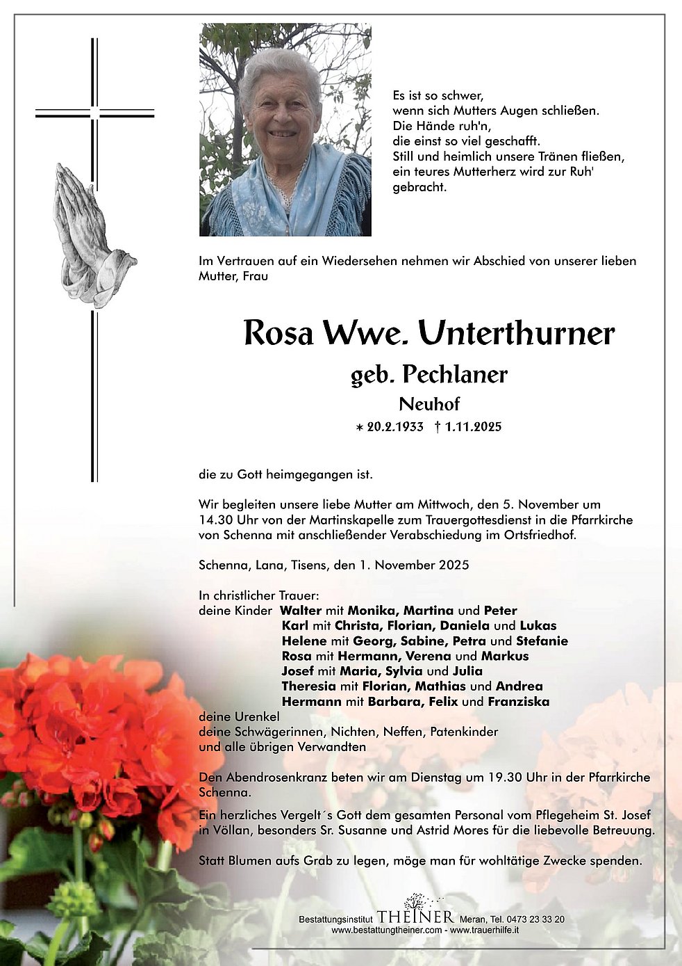 Wir begleiten unsere liebe Mutter am Mittwoch, den 5. November um 14.30 Uhr von der Martinskapelle zum Trauergottesdienst in die Pfarrkirche von Schenna mit anschließender Verabschiedung im Ortsfriedhof.