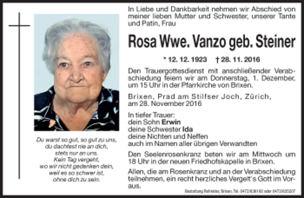 Den Trauergottesdienst mit anschließender Verabschiedung feiern wir am Donnerstag, 1. Dezember, um 15 Uhr in der Pfarrkirche von Brixen.