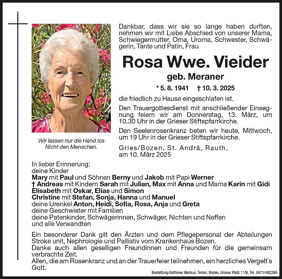 Den Trauergottesdienst mit anschließender Einsegnung feiern wir am Donnerstag, dem 13. März, um 10.30 Uhr in der Grieser Stiftspfarrkirche.