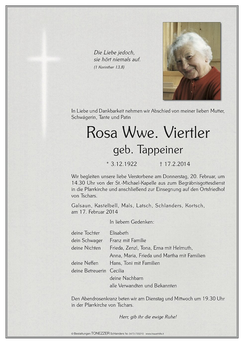 Wir begleiten unsere liebe Verstorbene am Donnerstag, 20. Februar, um 14.30 Uhr von der St.-Michael-Kapelle aus zum Begräbnisgottesdienst in die Pfarrkirche und anschließend zur Einsegnung auf den Ortsfriedhof von Tschars.