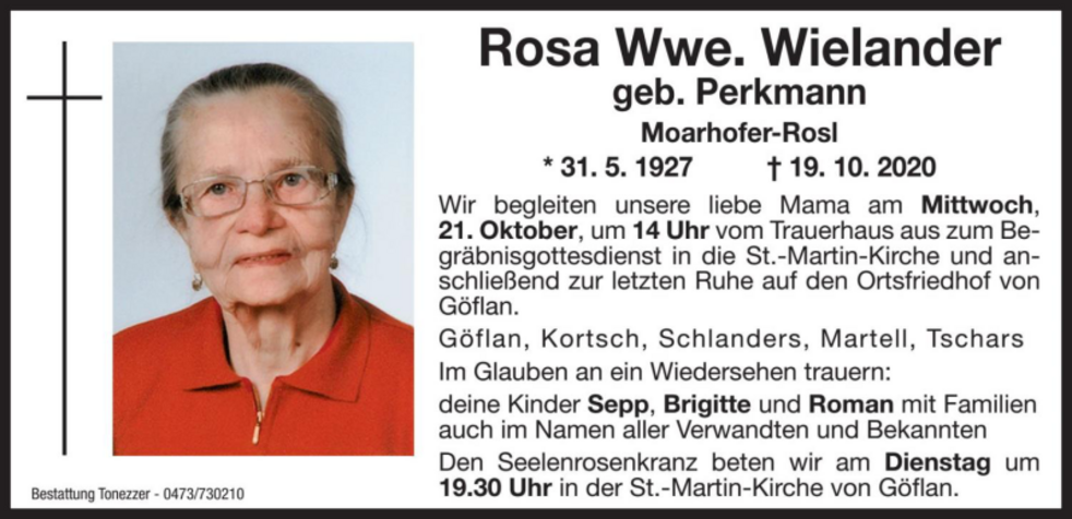 Wir begleiten unsere liebe Mama am Mittwoch, 21. Oktober, um 14 Uhr vom Trauerhaus aus zum Begräbnisgottesdienst in die St.-Martin-Kirche und anschließend zur letzten Ruhe auf den Ortsfriedhof von Göflan.