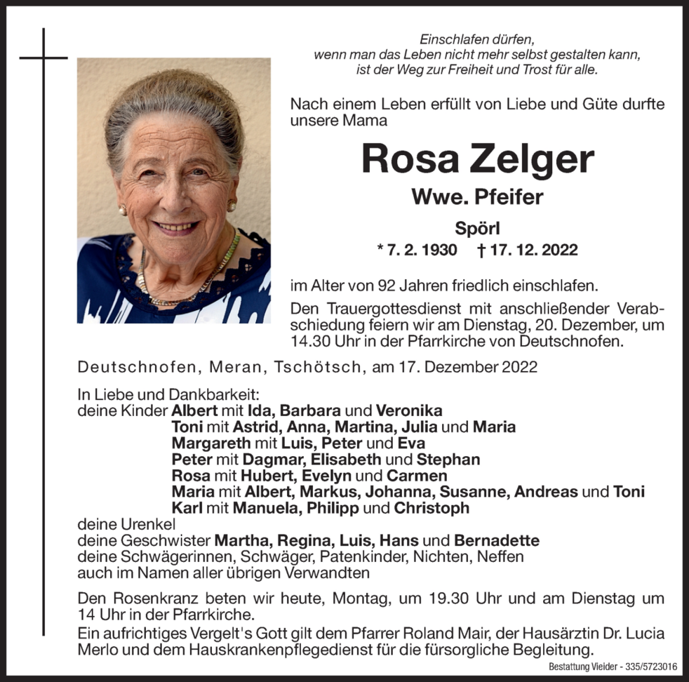 Den Trauergottesdienst mit anschließender Verabschiedung feiern wir am Dienstag, 20. Dezember, um 14.30 Uhr in der Pfarrkirche von Deutschnofen.