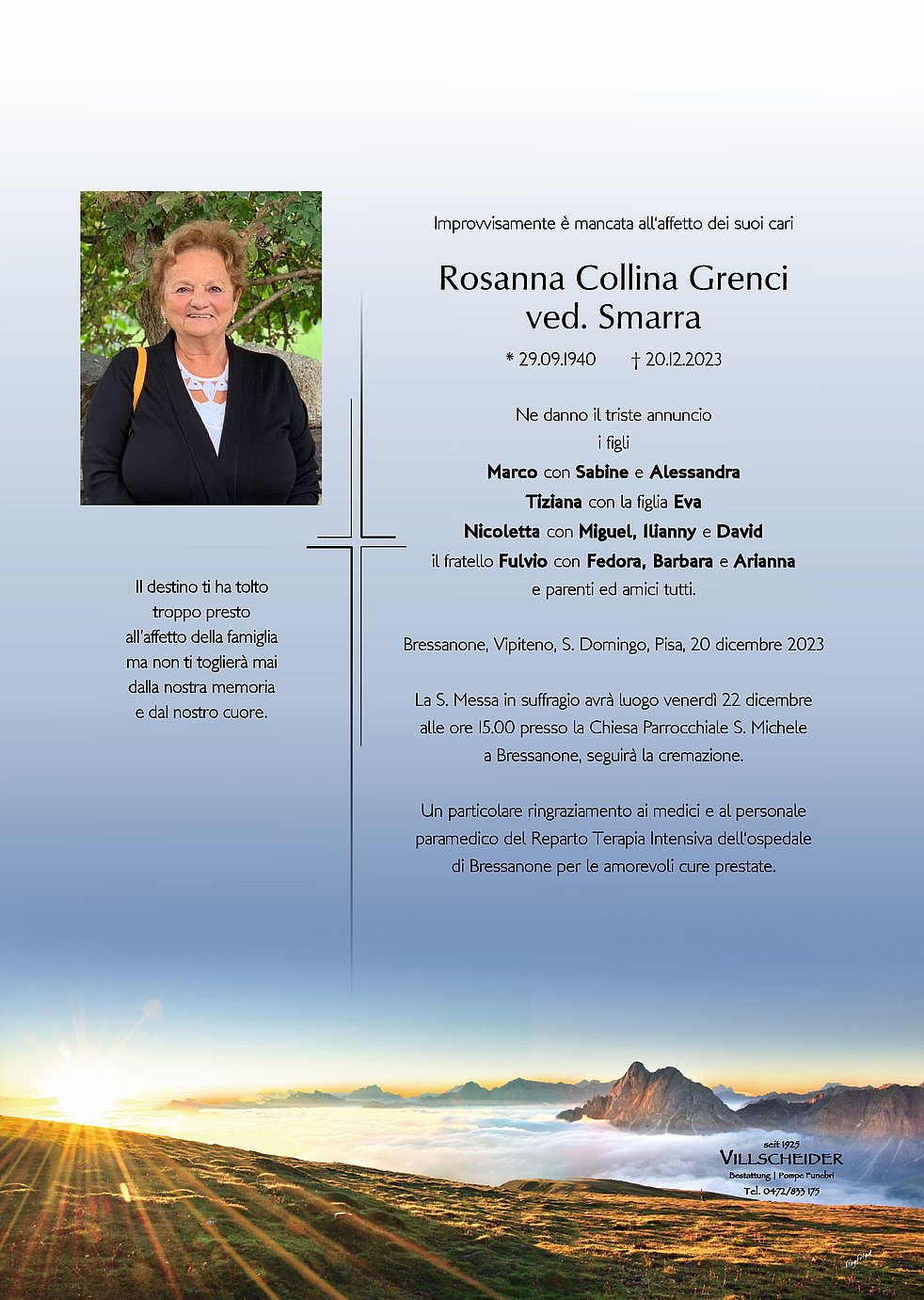 Trauerfeier: 22.12. - 15:00 Uhr Brixen; Bressanone