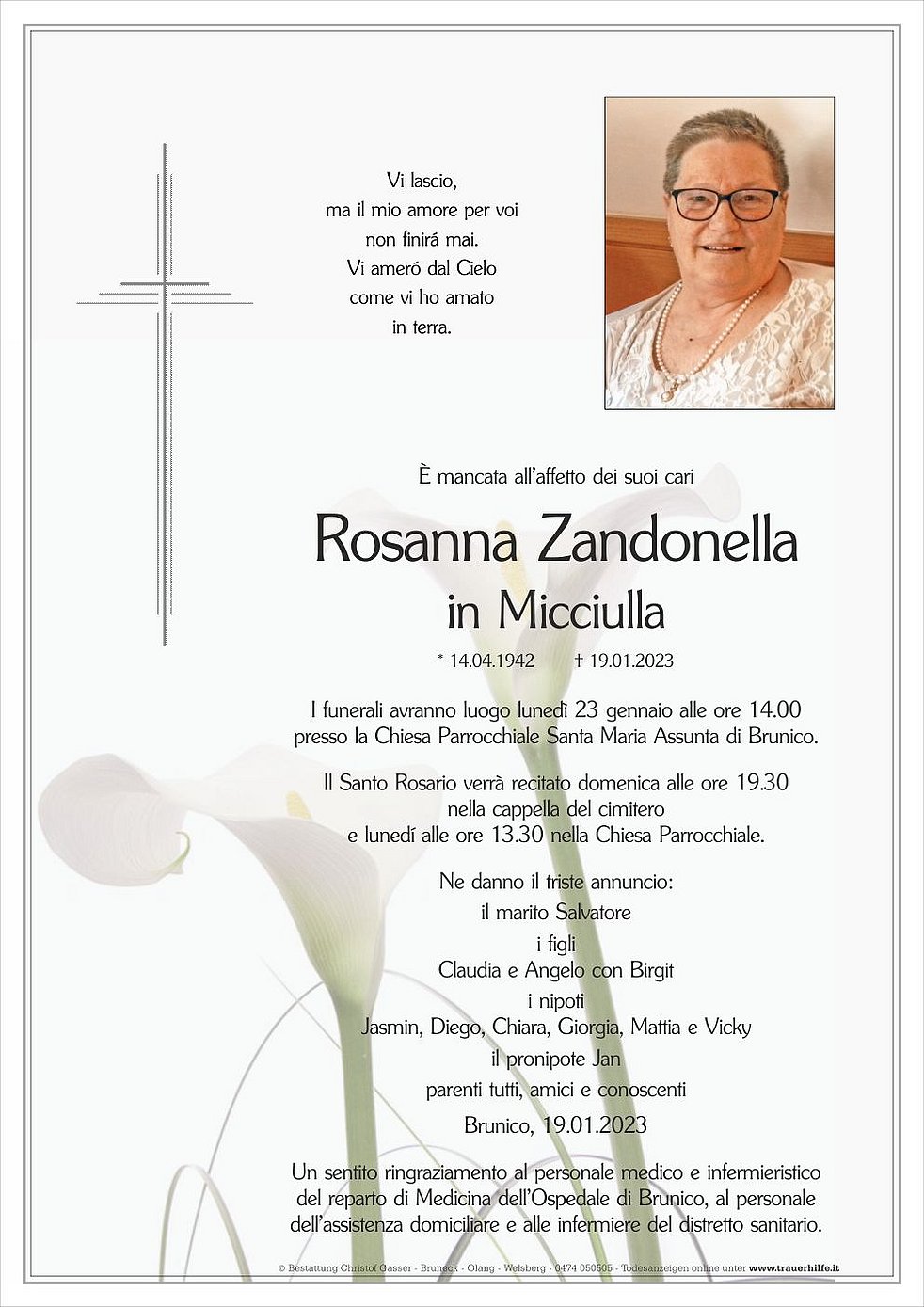 I funerali avranno luogo lunedì 23 gennaio alle ore 14.00