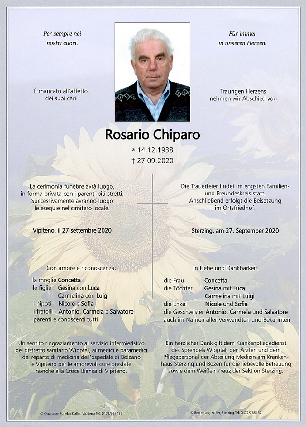 Un sentito ringraziamento al servizio infermieristico del distretto sanitario Wipptal, ai medici e paramedici del reparto di medicina dell‘ospedale di Bolzano e Vipiteno per le amorevoli cure prestate nonché alla Croce Bianca di Vipiteno.
