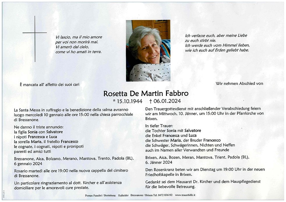 Trauerfeier: 10.01. - 15:00 Uhr Pfarrkirche Brixen
