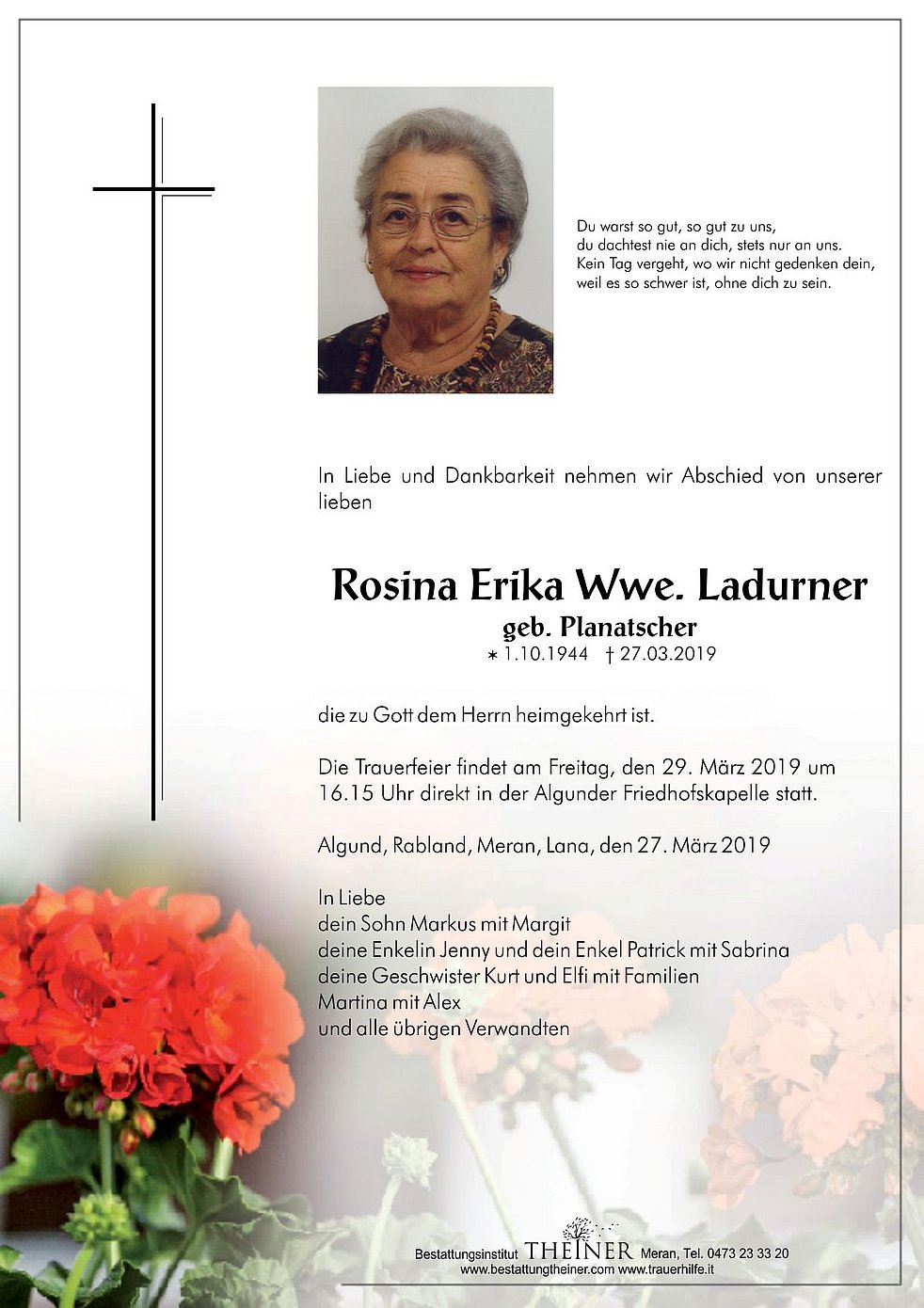 Die Trauerfeier findet am Freitag, den 29. März 2019 um 16.15 Uhr direkt in der Algunder Friedhofskapelle statt.