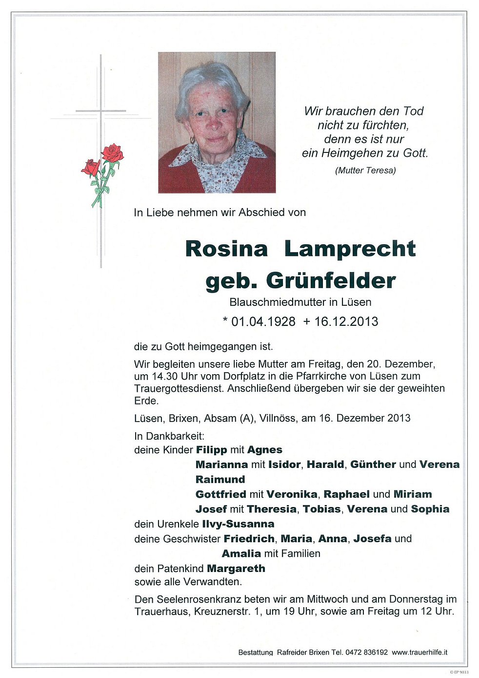 Wir begleiten unsere liebe Mutter am Freitag, den 20. Dezember, um 14.30 Uhr vom Dorfplatz in die Pfarrkirche von Lüsen zum Trauergottesdienst. Anschließend übergeben wir sie der geweihten Erde.